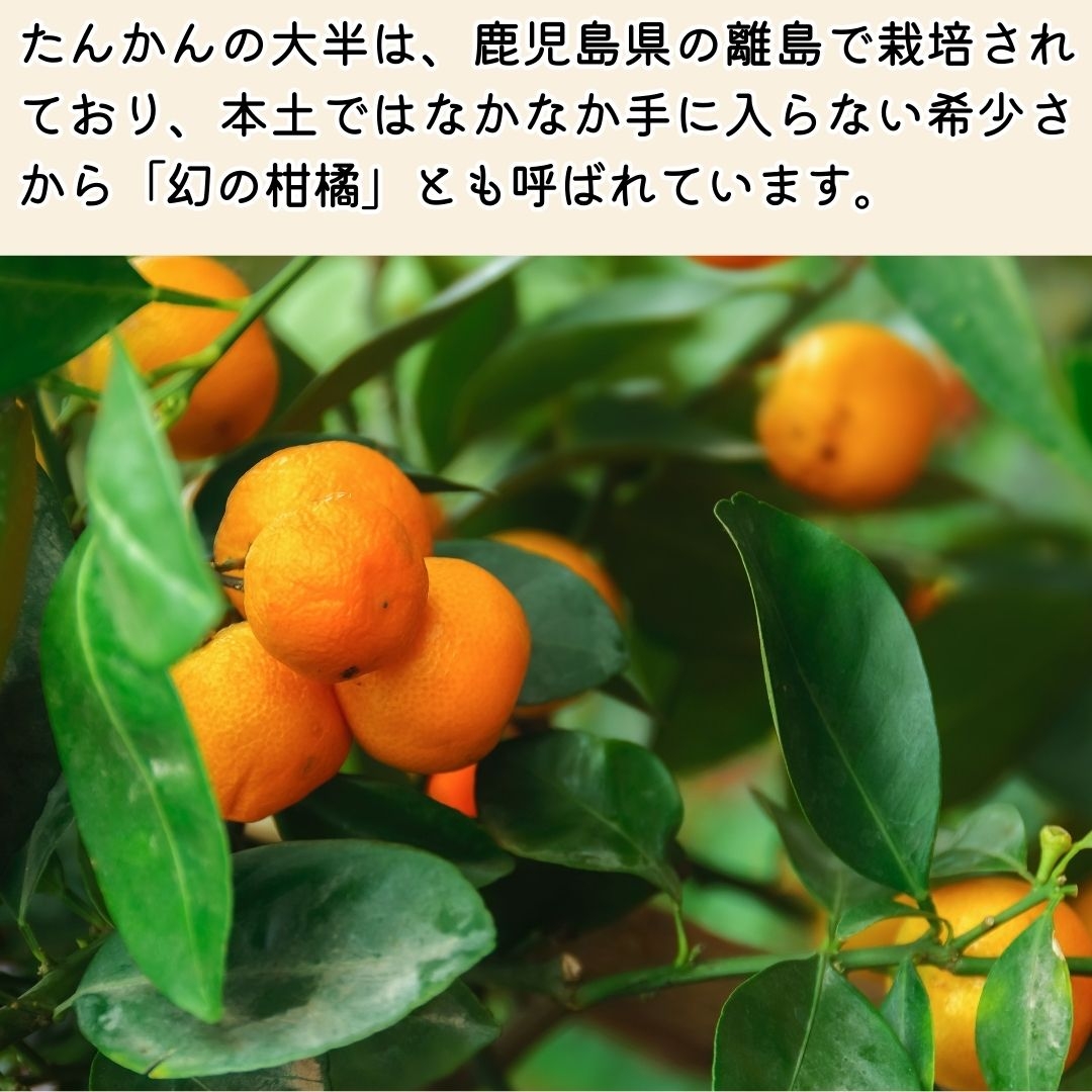 屋久島たんかんは、ぽんかんとネーブルオレンジの自然交配種で屋久島特有の温暖な気候と寒暖差が育む濃厚な甘さとジューシーさが特徴です。たんかんの大半は、鹿児島県の離島で栽培されており、本土ではなかなか手に入らない希少さから「幻の柑橘」とも呼ばれています。