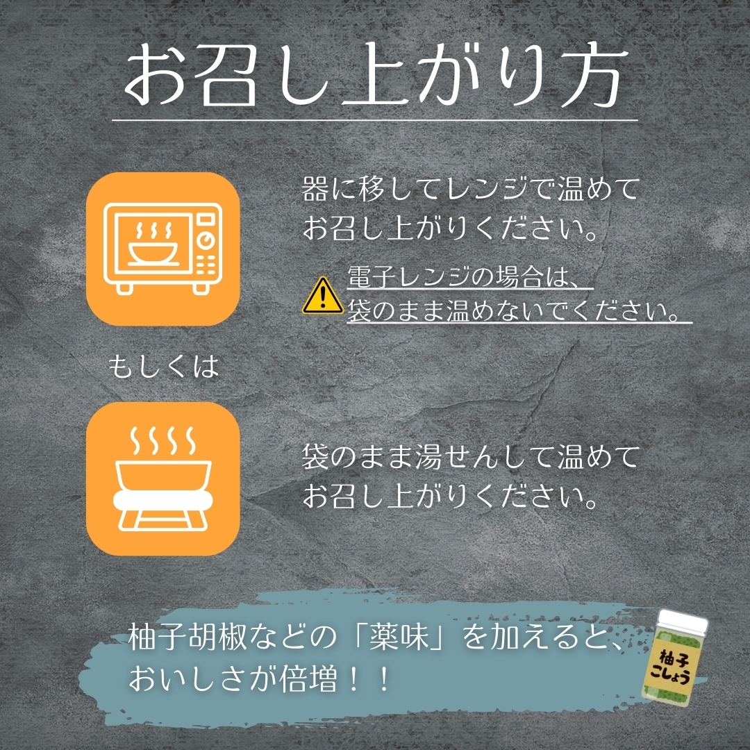 袋のまま湯せんするか、器に移してレンジで温めてお召し上がりください。