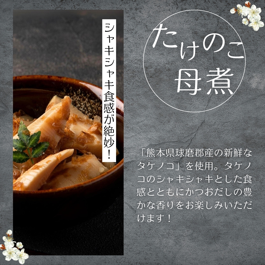 筍(熊本県産)、しょうゆ、砂糖、みりん、醸造調味料、花鰹/調味料(アミノ酸等)、甘味料(甘草)、(一部に大豆・小麦を含む)