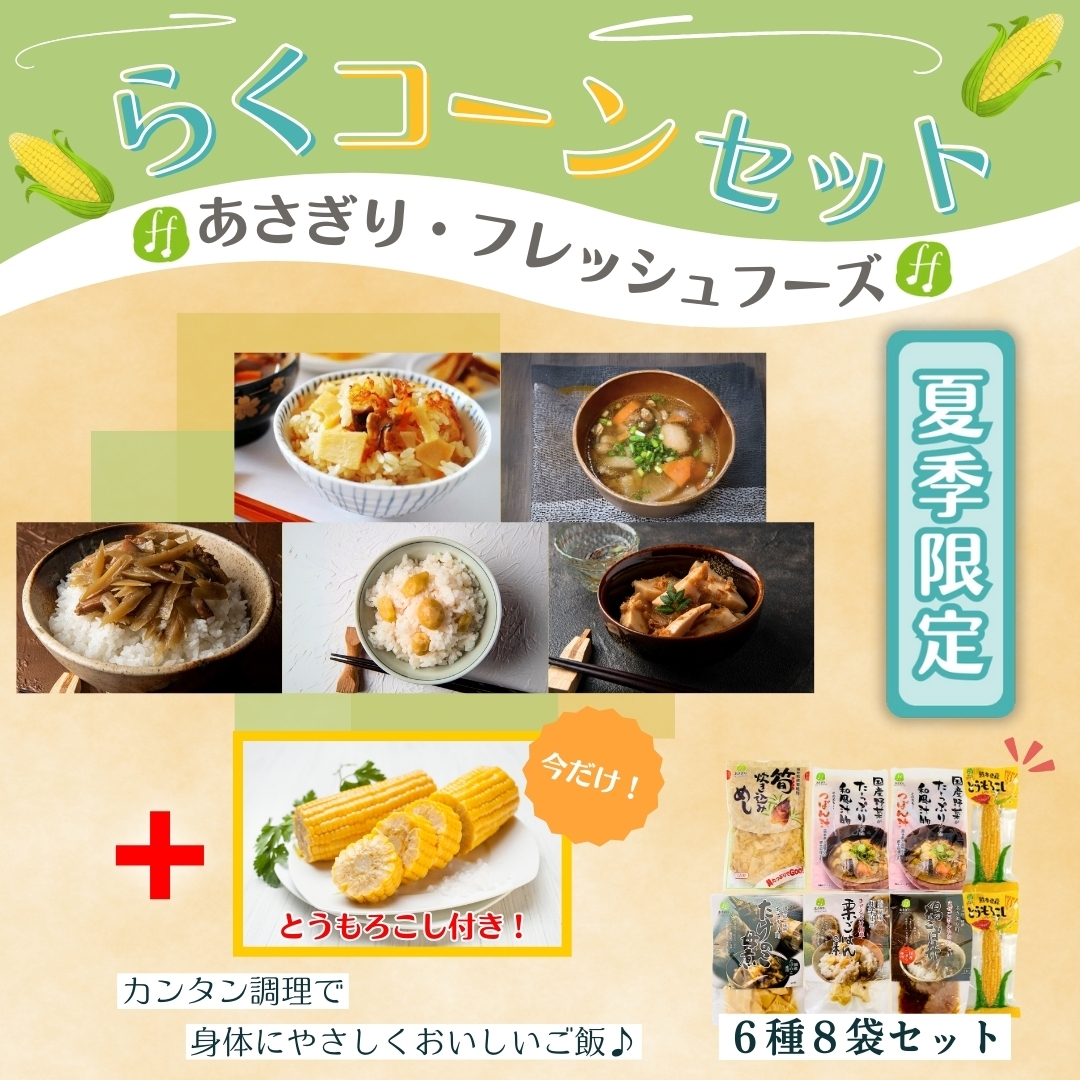あさぎり・フレッシュフーズのらくらくセットに夏季限定で『とうもろこしが2本』ついてくる「らくコーンセット」!「らくらく」調理でお召し上がりいただける商品内容となっています。御中元・お歳暮・その他ギフトのほか、非常食・備蓄食料にも最適です☆
