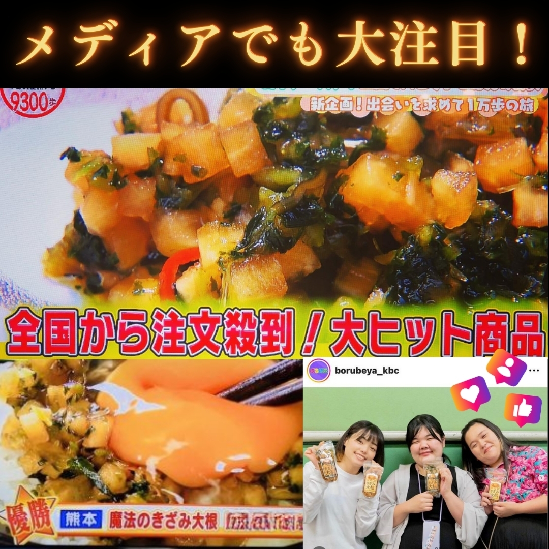 くまもと阿蘇産の大根をこだわりの大きさできざみ、漬け込むことで、シャキシャキの歯ごたえで、味染みもいい、とってもおいしいご飯のお供になりました。