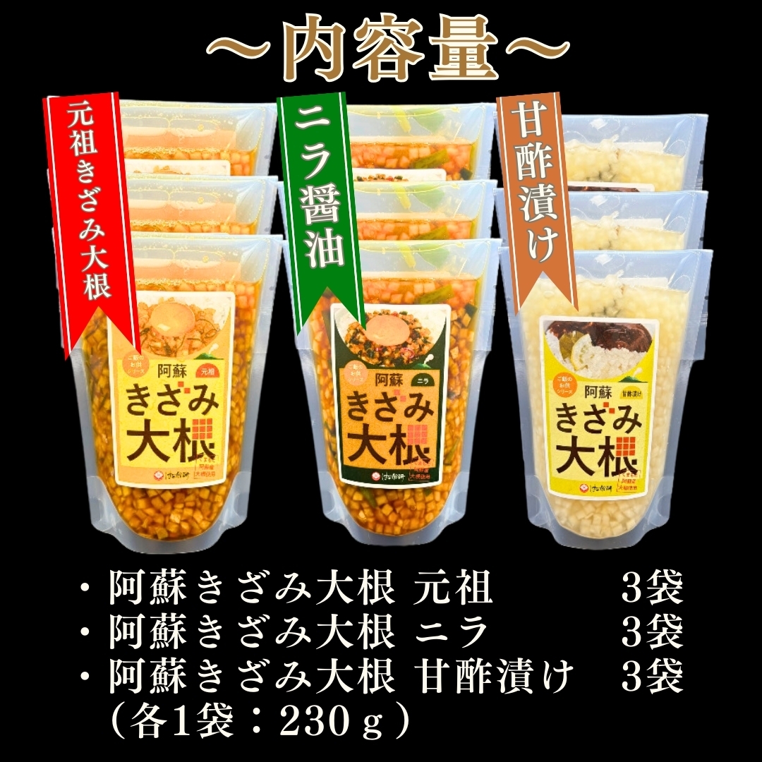 セット内容:阿蘇きざみ大根 元祖、ニラ、甘酢漬け×各3袋、合計9袋