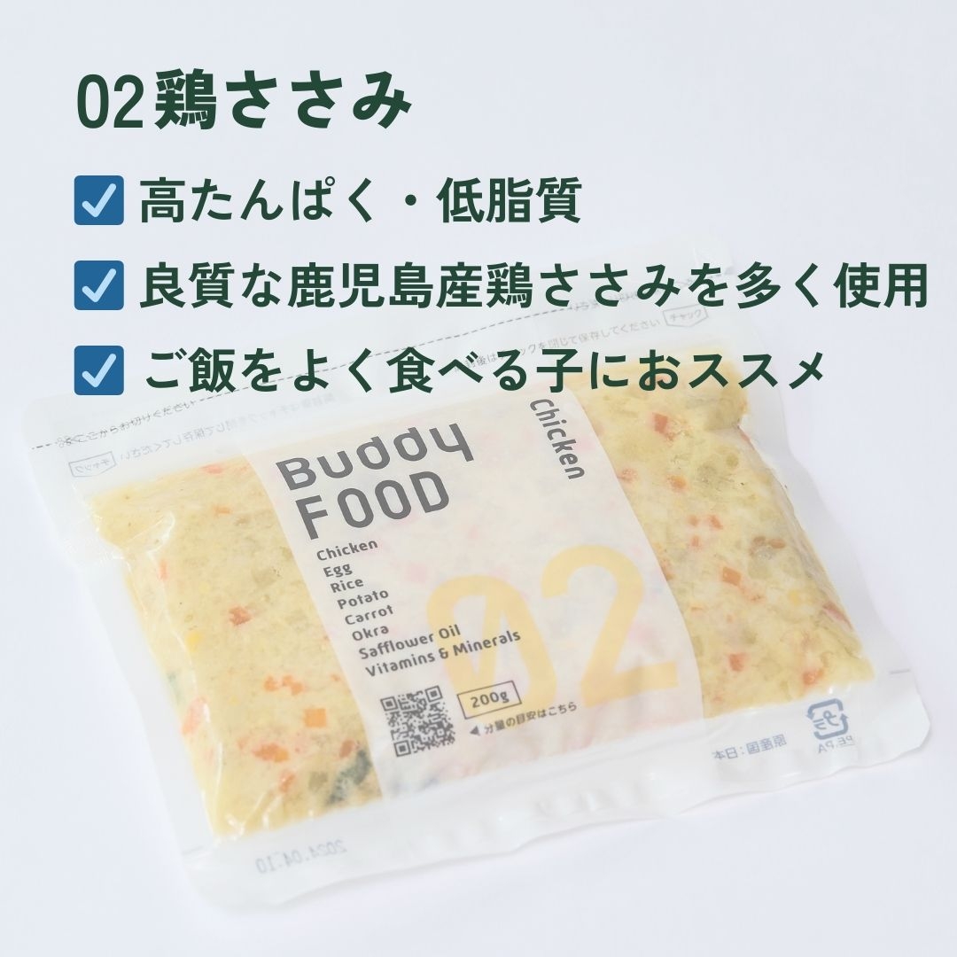 じゃがいも、鶏ささみ、米、鶏卵、にんじん、オクラ、食用サフラワー油、ビタミン・ミネラル類