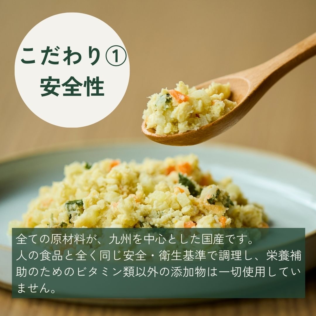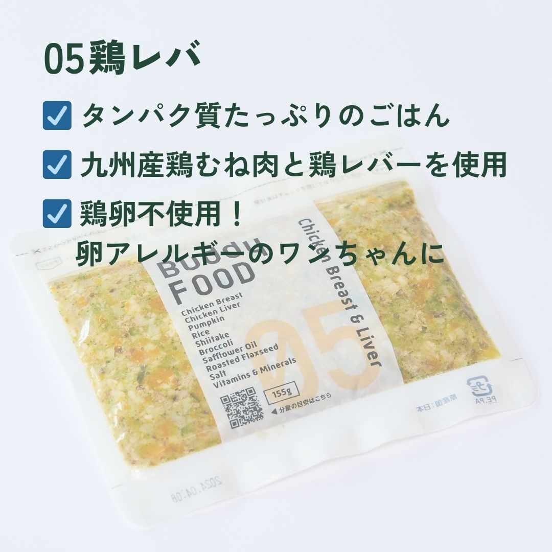 九州産の鶏レバーと鶏むね肉を使用した、タンパク質たっぷりのごはん。鶏卵を使用していないので卵アレルギーのワンちゃんにも!