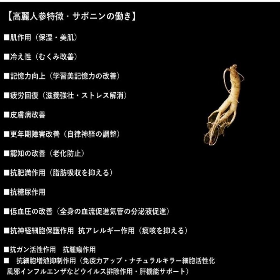 ・疲労回復・滋養強壮・ストレス解消・冷え性・むくみ改善・保湿・更年期障害改善・自律神経の調整・学習記憶力の改善・認知の改善・老化防止・抗肥満作用・抗糖尿作用・低血圧の改善(全身の血流促進気管の分泌液促進)・抗アレルギー作用(痰咳を抑える)・抗ガン活性作用・抗腫瘍作用・抗細胞増殖抑制作用(免疫力アップ・ナチュラルキラー細胞活性化・風邪インフルエンザなどウイルス排除作用)・肝機能保護