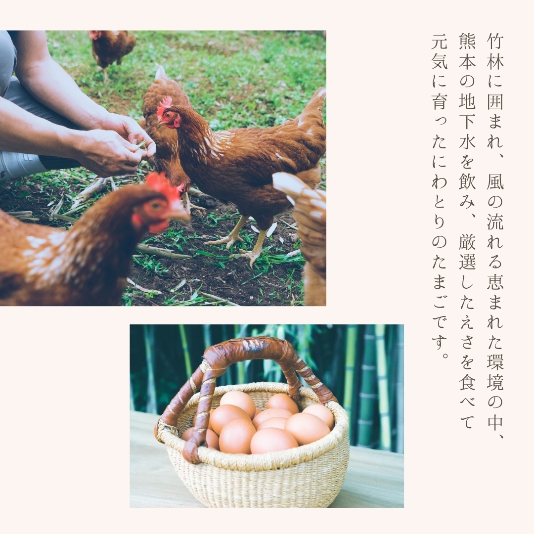 竹林に囲まれ、風の流れる恵まれた環境の中、熊本の地下水を飲み、厳選したえさを食べて元気に育ったたまごです。