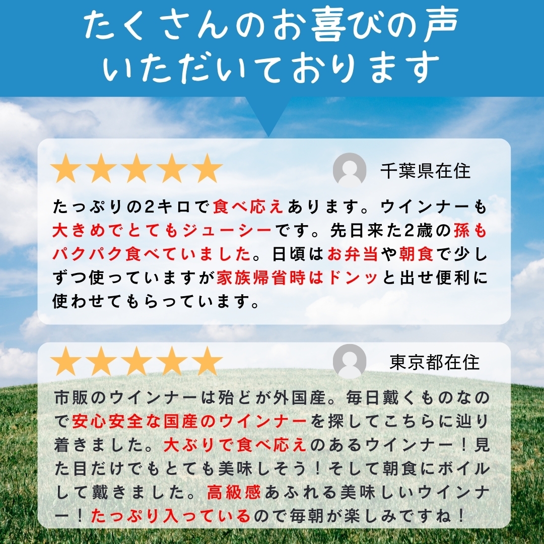 お肉を知り尽くしたナンチクが「日本一うまい」ウインナーを目指して生み出したジューシーなウインナーを合計2kgお届けします。