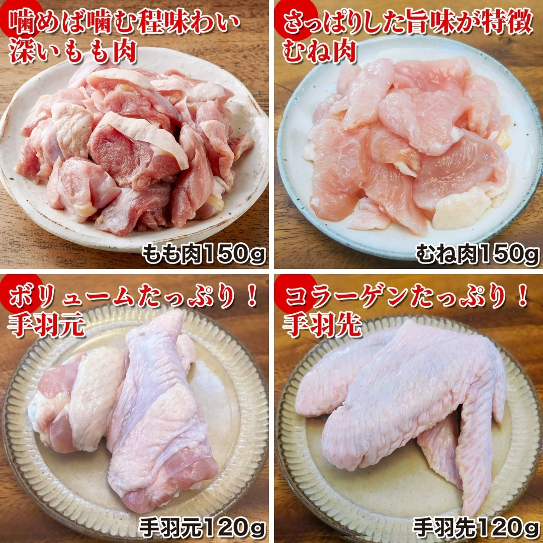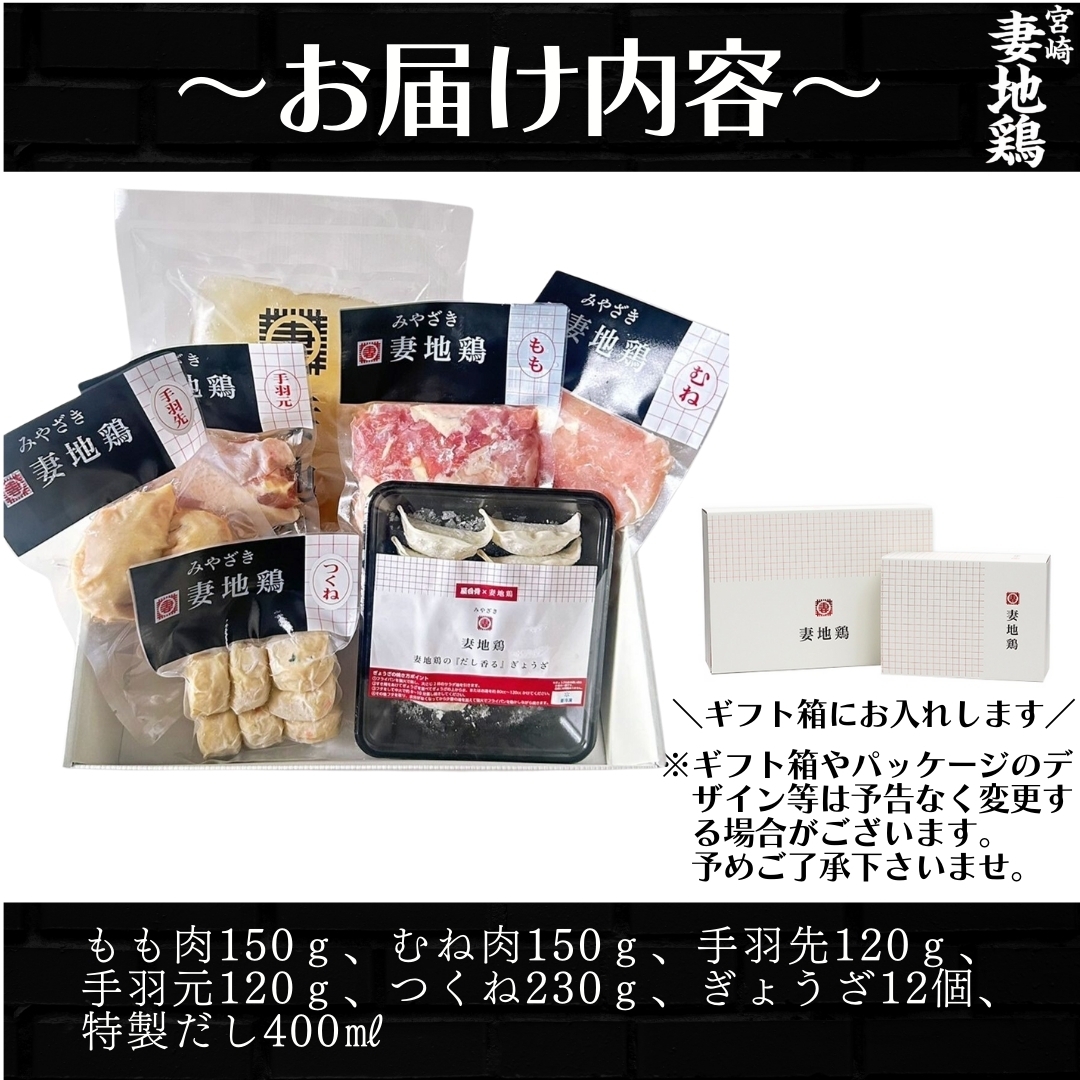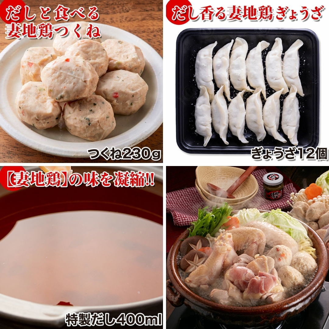 内容量:①妻地鶏もも肉150g②妻地鶏むね肉150g③妻地鶏手羽先120g④妻地鶏手羽元120g⑤妻地鶏つくね230g⑥妻地鶏ぎょうざ12個⑦特製だし400ml