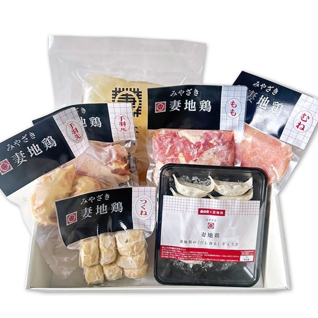 内容量:①妻地鶏もも肉150g②妻地鶏むね肉150g③妻地鶏手羽先120g④妻地鶏手羽元120g⑤妻地鶏つくね230g⑥妻地鶏ぎょうざ12個⑦特製だし400ml