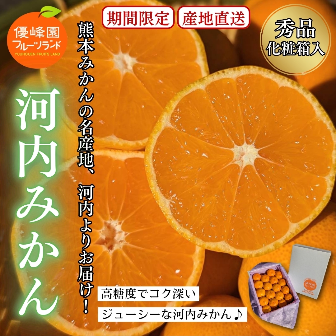 観光農園「優峰園フルーツランド」から、『秀品!』『化粧箱入』で甘みと酸味のバランスが抜群な河内みかんを期間限定で販売いたします!