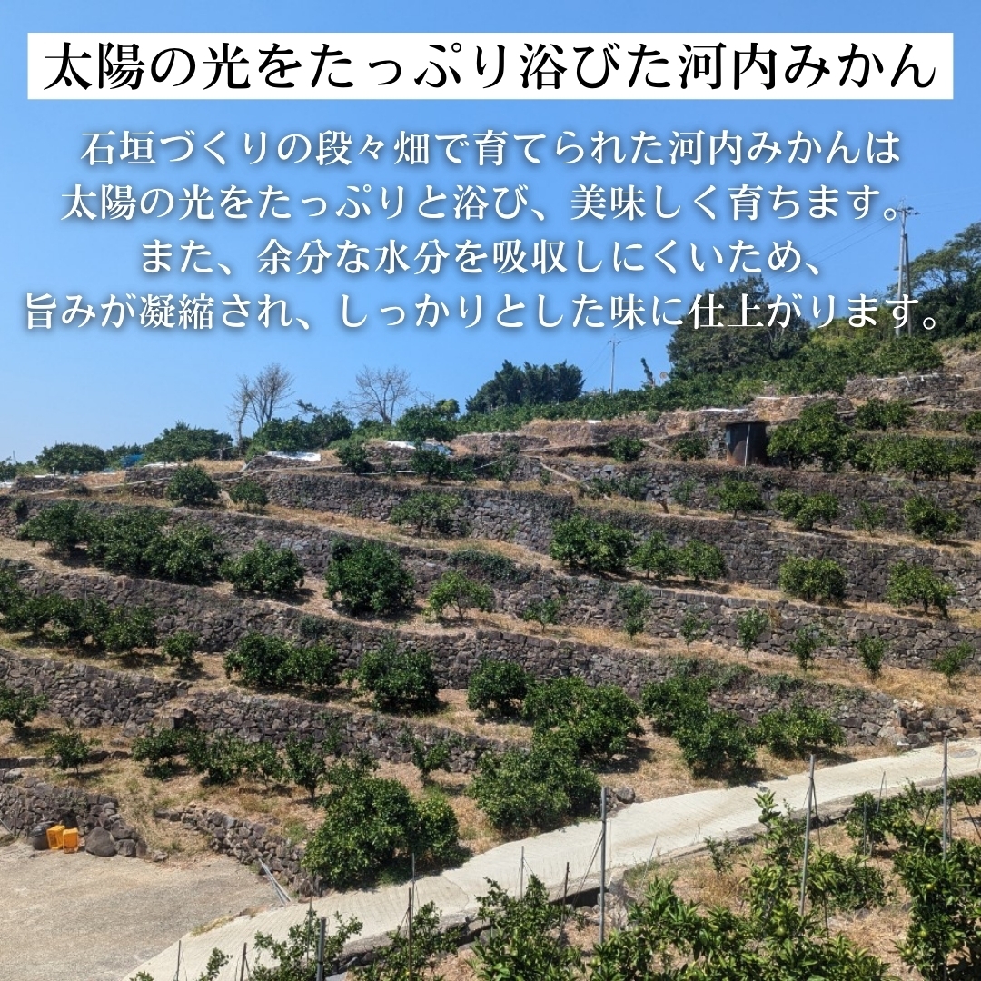 石垣づくりの段々畑で育てられた河内みかんは太陽の光をたっぷりと浴び、美味しく育ちます。また、余分な水分を吸収しにくいため、旨みが凝縮され、しっかりとした味に仕上がります。
