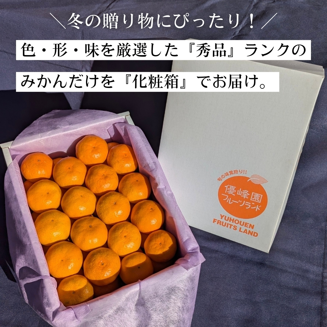 色・形・味を厳選した『秀品』ランクのみかんだけを『化粧箱』に入れお送りいたします。大切な方への贈り物にぜひ優峰園フルーツランドのみかんをご利用ください♪