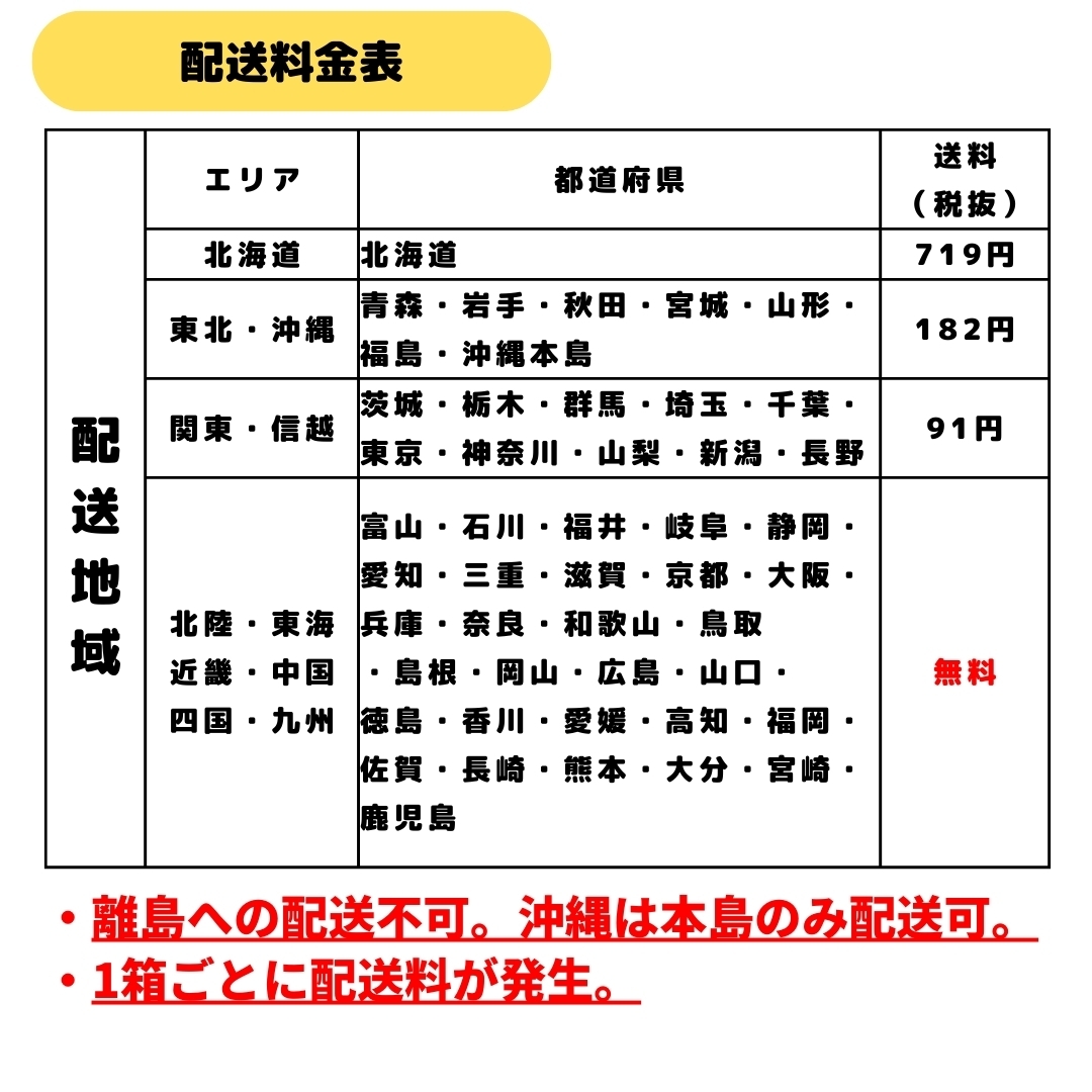 北海道:719 円、東北・沖縄:182円、関東・信越:91円、北陸・東海・近畿・中国・四国・九州:無料