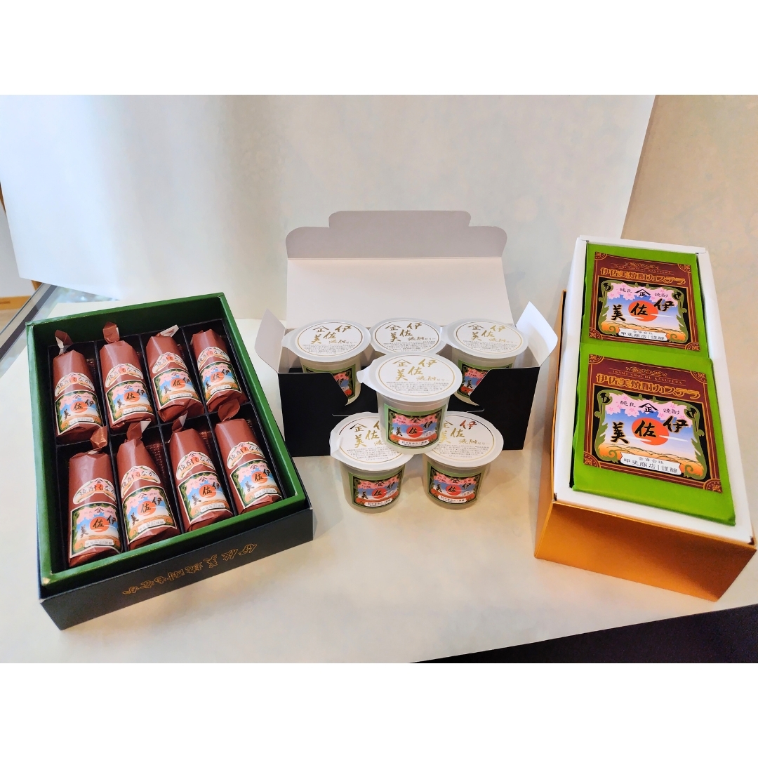 ほんのり甘いゼリー、一升瓶のパッケージのもなか、伊佐美をふんだんに振りかけたカステラの三種類。