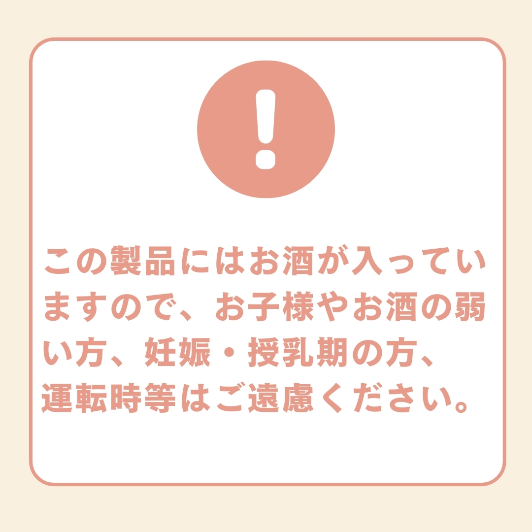 この商品はアルコール入りです。お子様や妊娠中の方、お酒の苦手な方にはお薦めいたしません。また、お車の運転前にはお控えください。