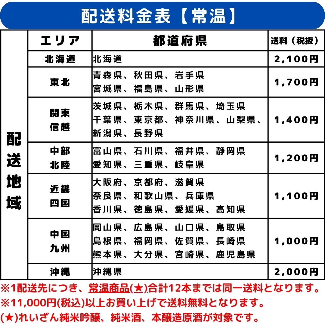 ・1配送先につき、れいざん純米吟醸、純米酒、本醸造原酒の3種計12本まで同一送料となります。