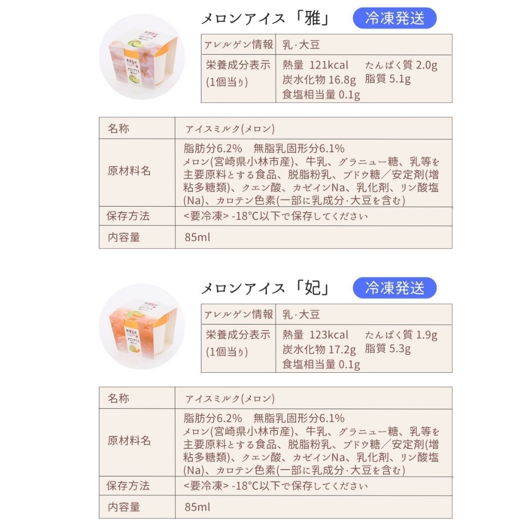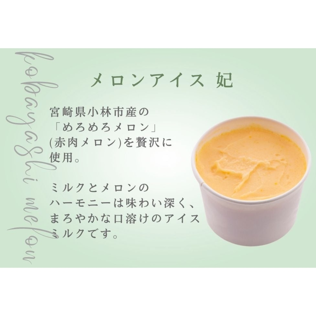 宮崎県小林市産の「めろめろメロン」(青肉メロン)を贅沢に使用したアイスです。ミルクとメロンのハーモニーは濃厚で優しい口溶けが特徴です。