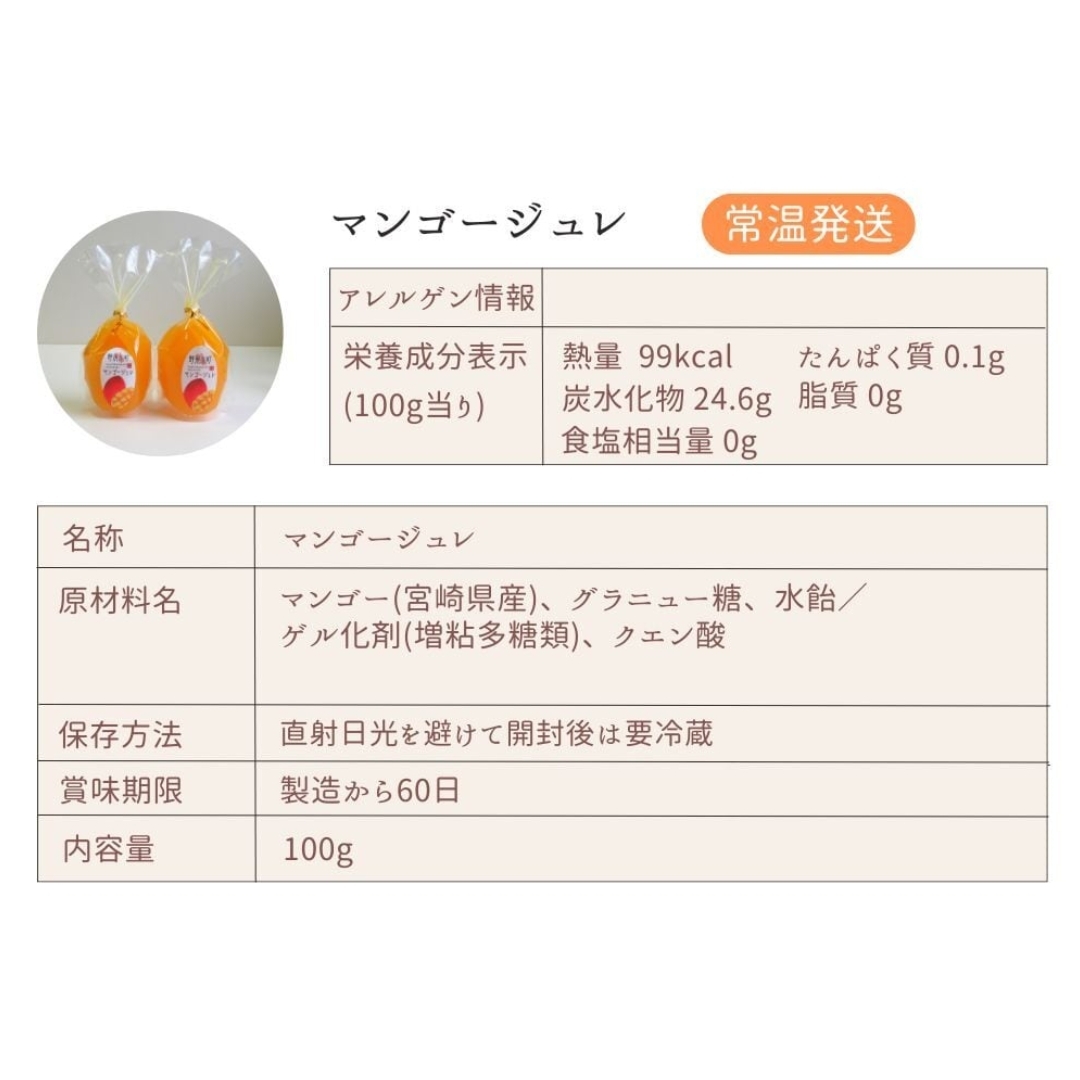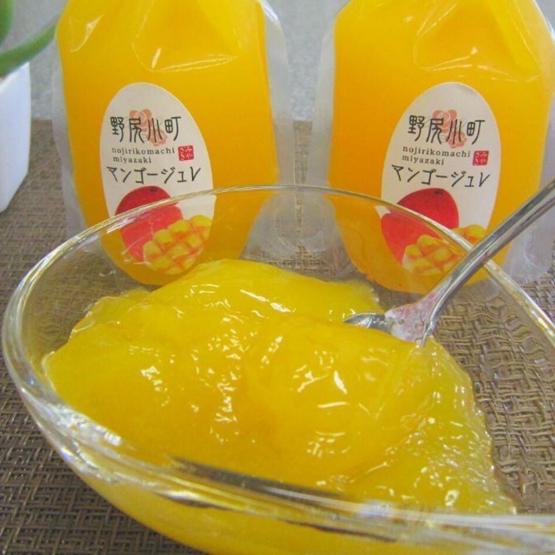 ジュレ:自社製の地元小林産のマンゴーピューレを35%使用した手軽に食べられるジュレ(ゼリー)を作りました!ジュレの色もマンゴーそのもの!冷やして頂くと一層美味しさが増します。人気のトロピカルなジュレをぜひ一度お試しください。