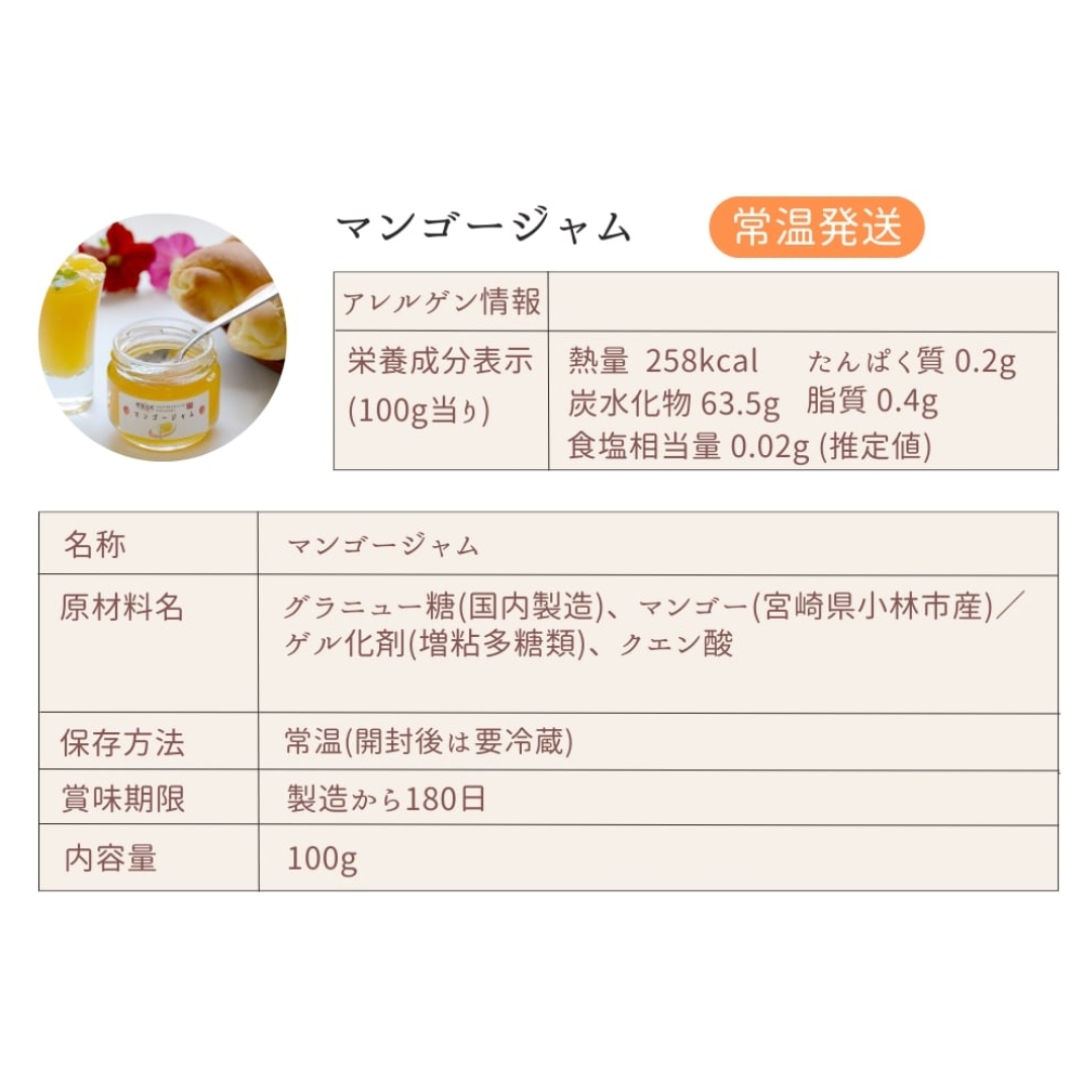 ジャム:自社製の地元小林産マンゴーピューレを贅沢に35%使用。とろけるような宮崎のマンゴーを手軽に楽しめます!パンやヨーグルトにピッタリのマンゴージャムです。2個入りとなっていますので、ご自宅用や親しい人へのおすそ分けとしてもオススメです。