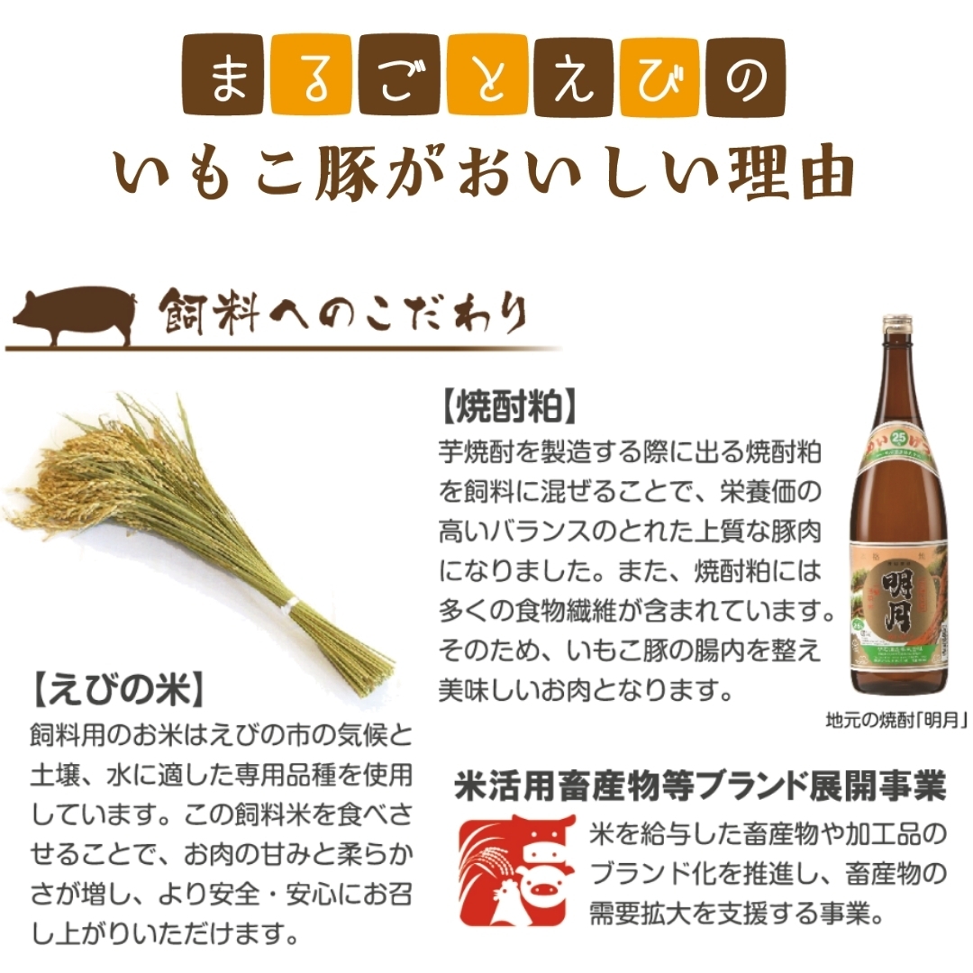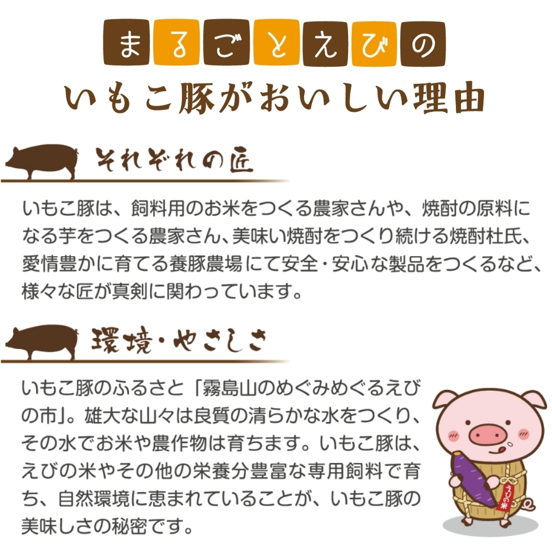 「いもこ豚」とは、宮崎県えびの市産の「お米」と「焼酎粕」をブレンドした飼料を与え、えびのの山頂で健やかに育った豚のことです。