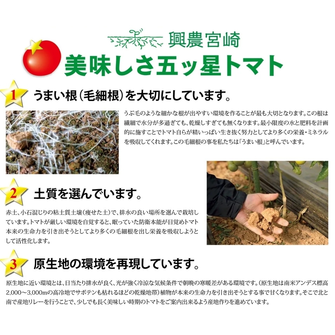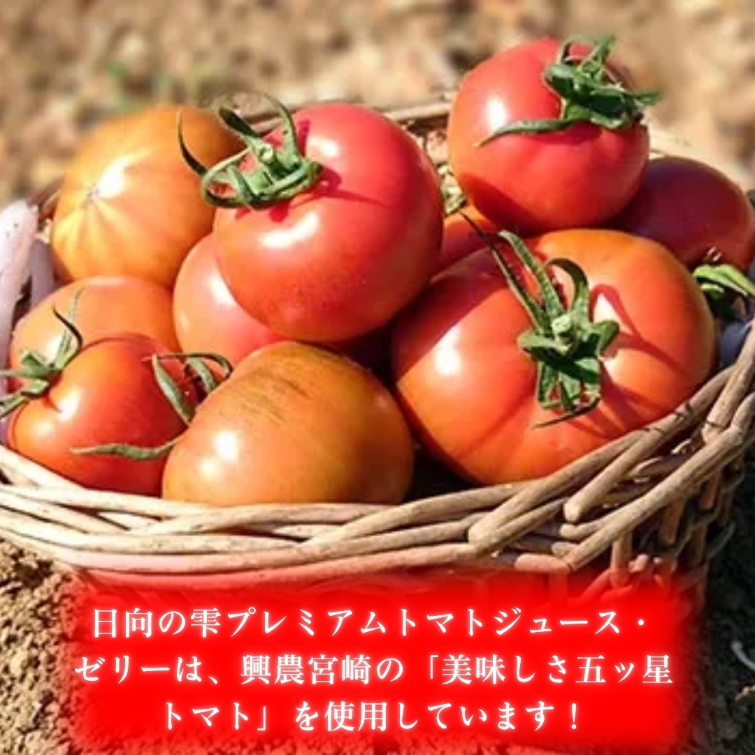 日向の雫プレミアムトマトジュースとゼリーは、興農宮崎の「美味しさ五ッ星トマト」を使用しています!
