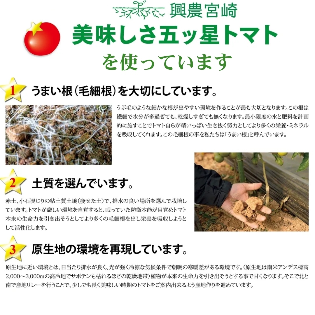 トマトそのものの味を大切にしてつくった興農宮崎の「美味しさ五ッ星トマト」を使用した『宮崎県産トマトジュース』