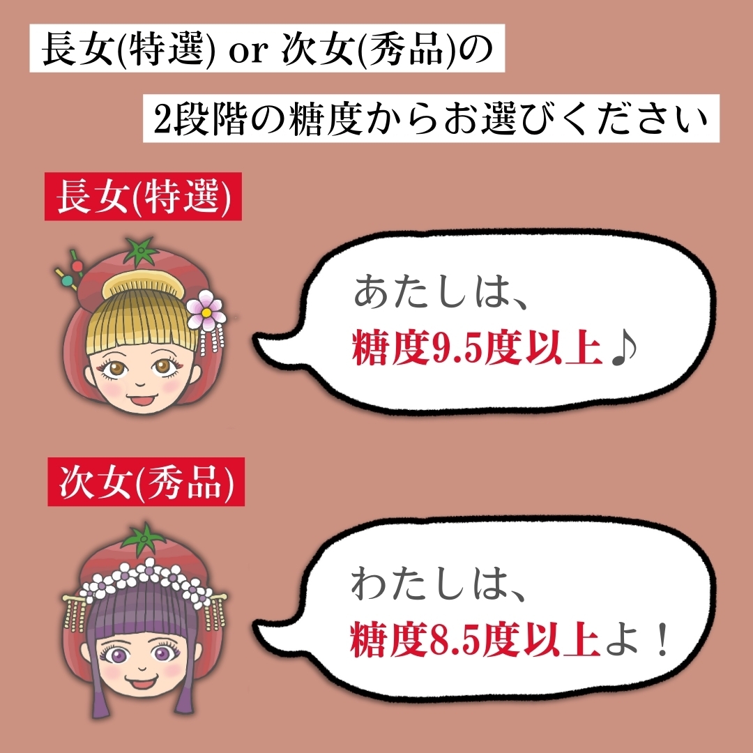 | 糖度を選ぶ | 長女(特選) 9.5度以上 次女(秀品) 8.5度以上 |