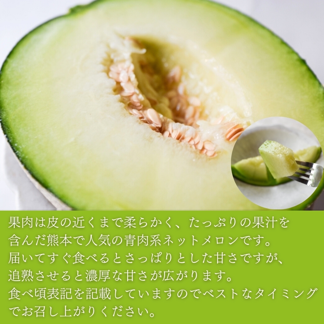 肥後グリーンメロンは、果肉は皮の近くまで柔らかく、たっぷりの果汁を含んだ青肉系ネットメロンです。