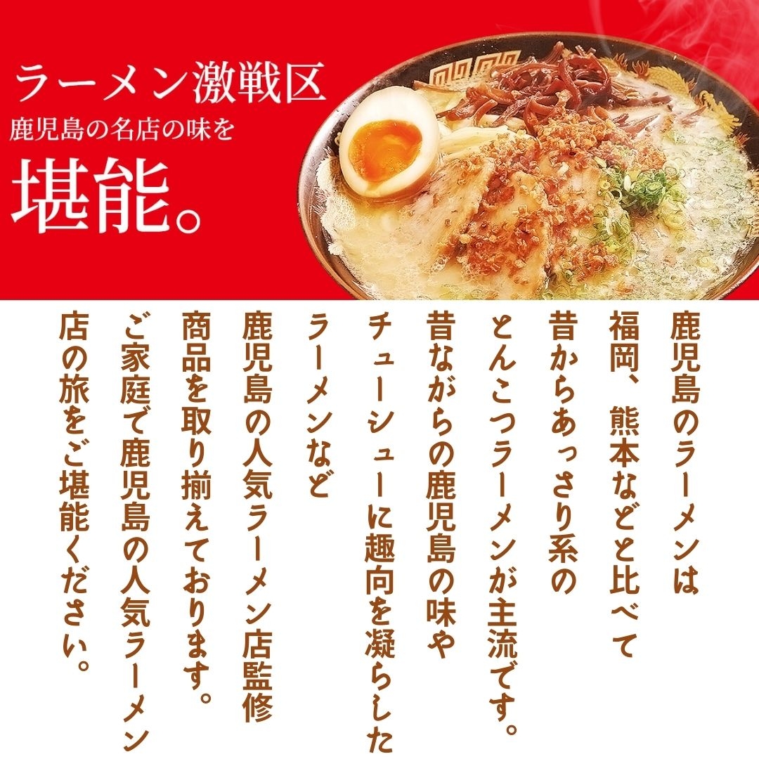 鹿児島の名店の味がご家庭で手軽に味わえるセットです。鹿児島ラーメン王決定戦優勝店、鹿児島を代表する老舗、鹿児島天文館で著名人が多数訪れる名店、チャーシューに特徴があり大人気の名店など5店舗の味をお楽しみ頂けます🍜