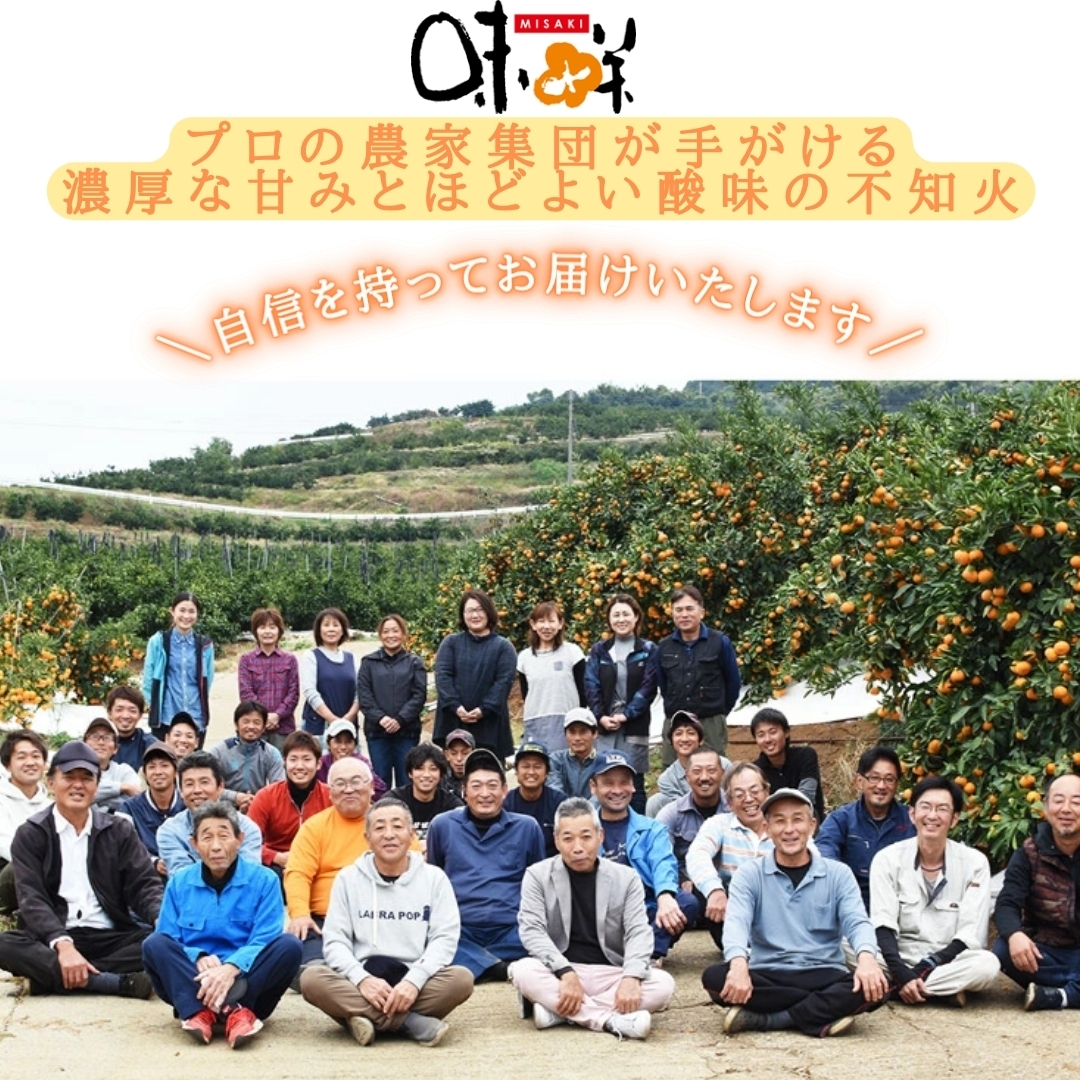 熊本県の河内町(芳野地区)と植木町で、柑橘類の栽培を行うプロの農家集団、株式会社味咲(みさき)。不知火は、魚成分主体の肥料を与えることで、海洋カルシウムやミネラル成分を多く含み、より美味しく育て上げております。そのため、ただ甘いだけでなく、濃厚な味わいと旨みが特徴です。
