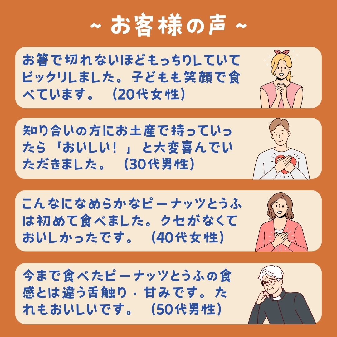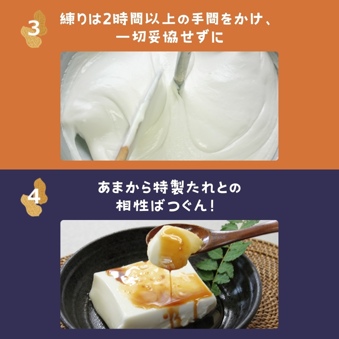 真心こめて作り上げたピーナッツとうふは、ピーナッツの風味と甘味を生かし、もっちりした食感となめらかな舌触りです。