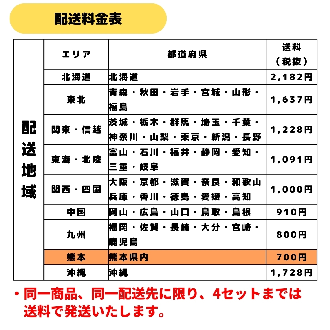 北海道:2,182円、東北:1,637円、関東・信越:1,228円、東海・北陸:1,091円、関西・四国:1,000円、中国:910円、九州(熊本県除く):800円、熊本県内:700円、沖縄:1,728円