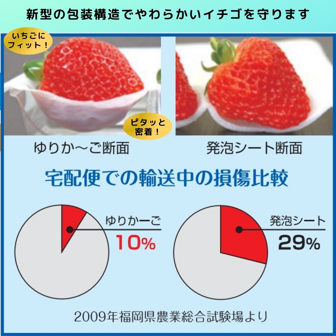 宙吊り包装でいちごを守る新型容器「ゆりかーご」で大事にお届け!この「ゆりかーご」で配送中の衝撃等からいちごを守ります!
