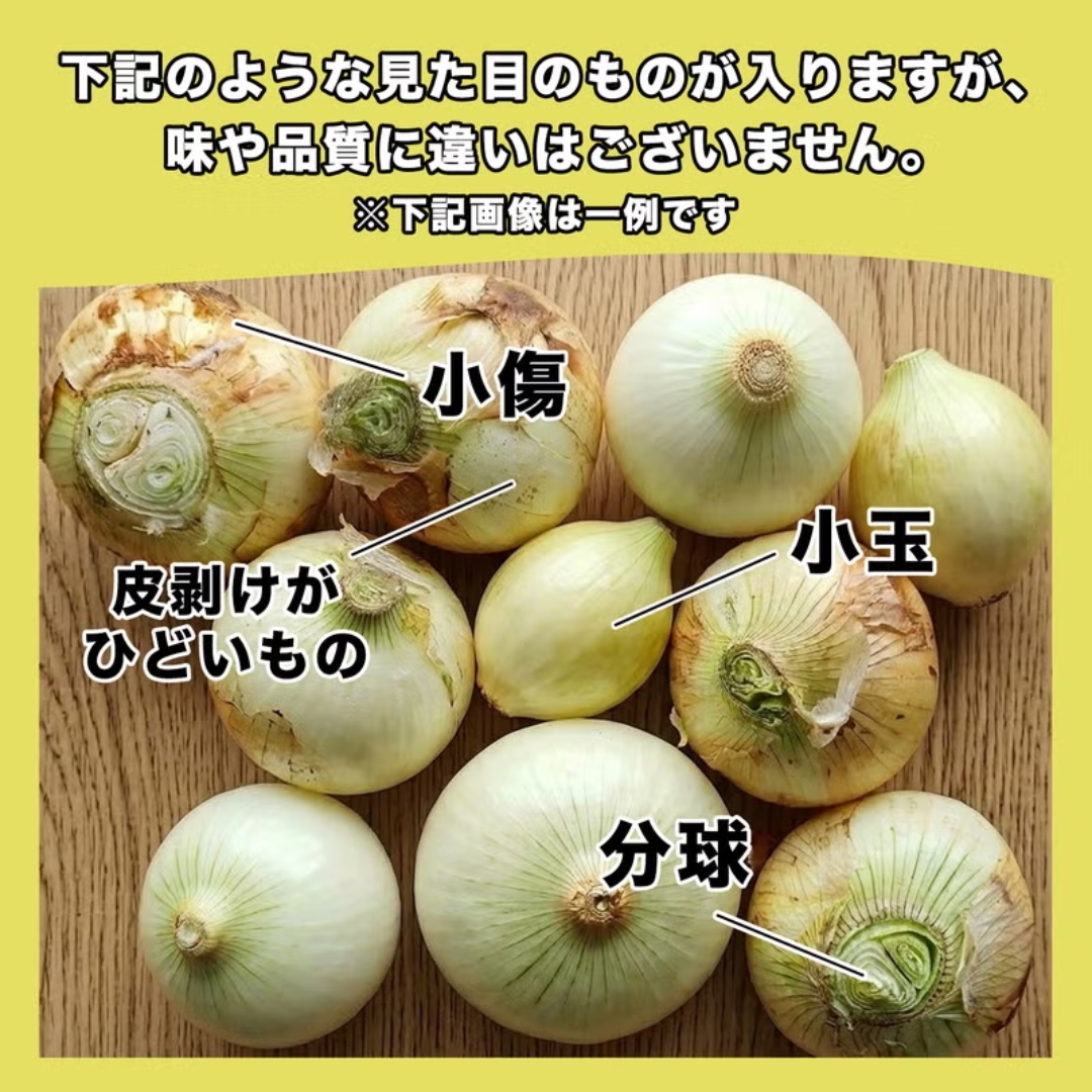サイズのばらつきや傷、皮剥け、分球などが理由で市場に出回りにくい玉ねぎですが、 中身の美味しさはそのまま。味も鮮度も通常品と変わりません。