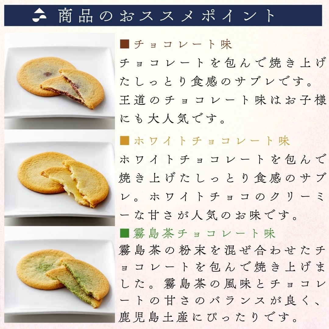 「生サブレ」とは、しっとりとした食感が特徴です。チョコレート・ホワイトチョコレート・霧島茶入りチョコレートを生地に包み、焼き上げています。実店舗や鹿児島空港内でとても人気のある商品の一つです。お子様からご年配の方まで幅広い方にお選びいただいています。