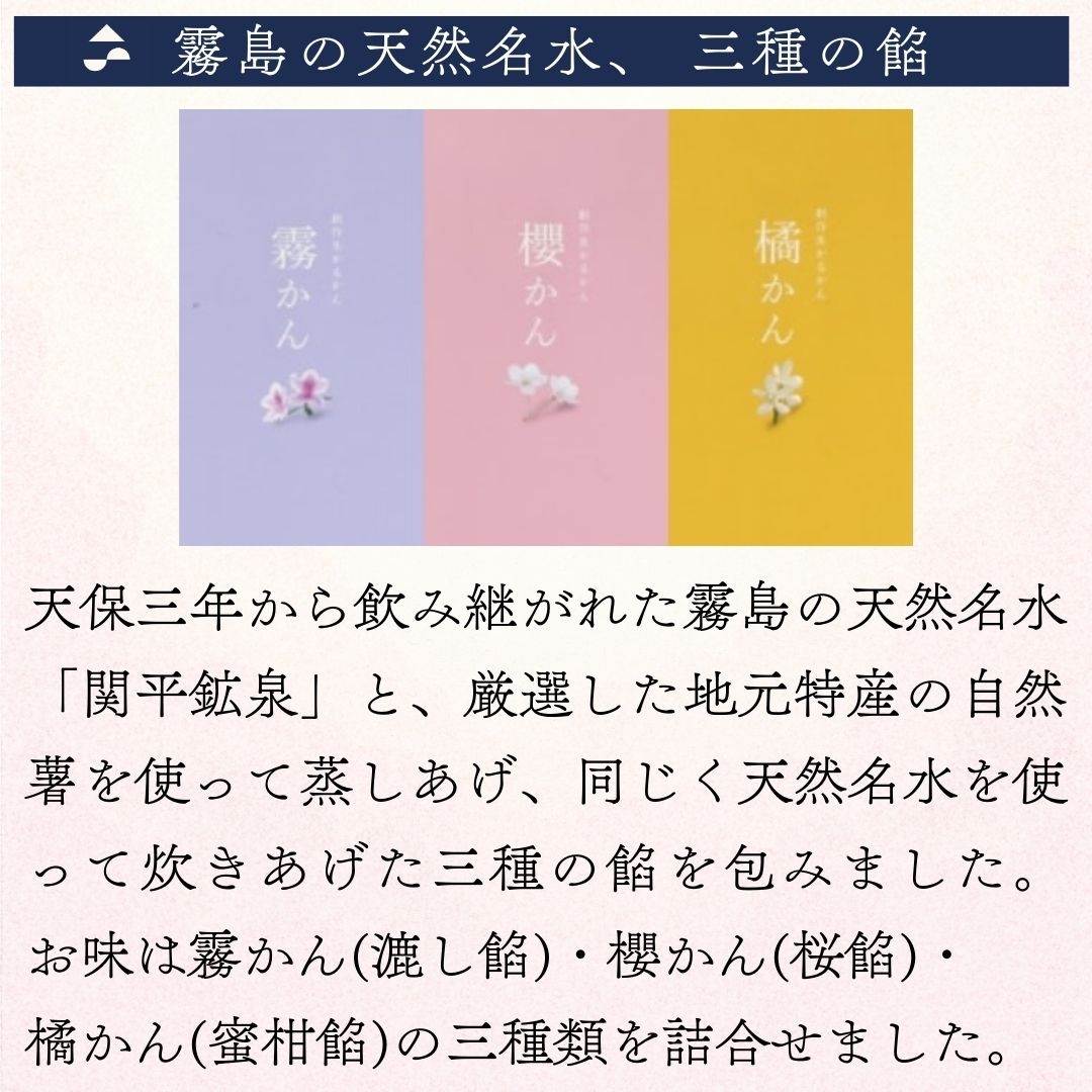 天保三年から飲み継がれた霧島の天然名水「関平鉱泉」と、厳選した地元特産の自然薯を使って蒸しあげ、同じく天然名水を使って炊きあげた三種の餡を包みました。 お味は霧かん(漉し餡)・櫻かん(桜餡)・橘かん(蜜柑餡)の三種類を詰合せました。