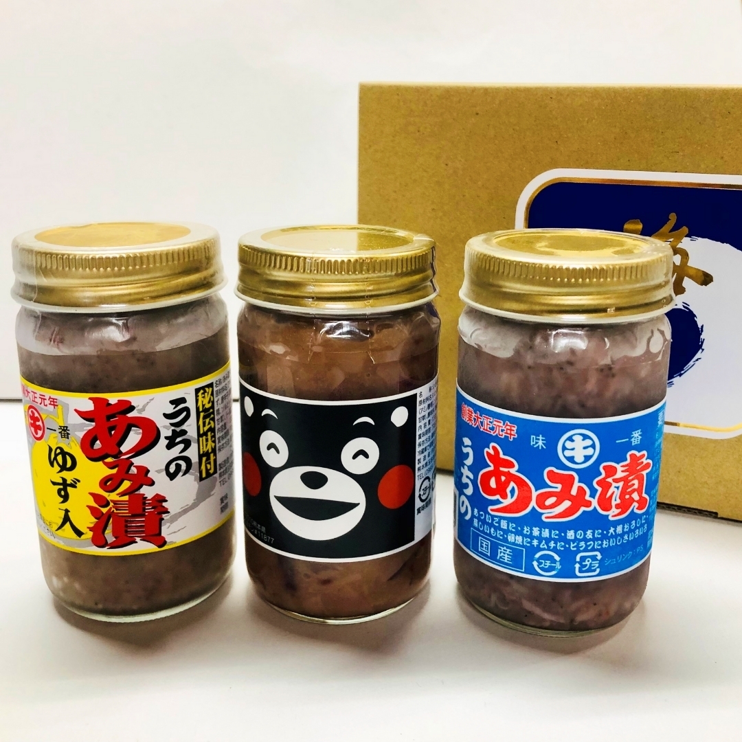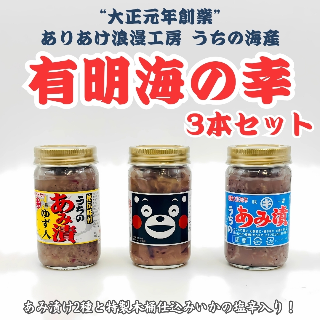 有明地方の名産として古くから親しまれているあみ漬2種類と北海道産のいかを使った塩辛をセットにした当店自慢のセットです。