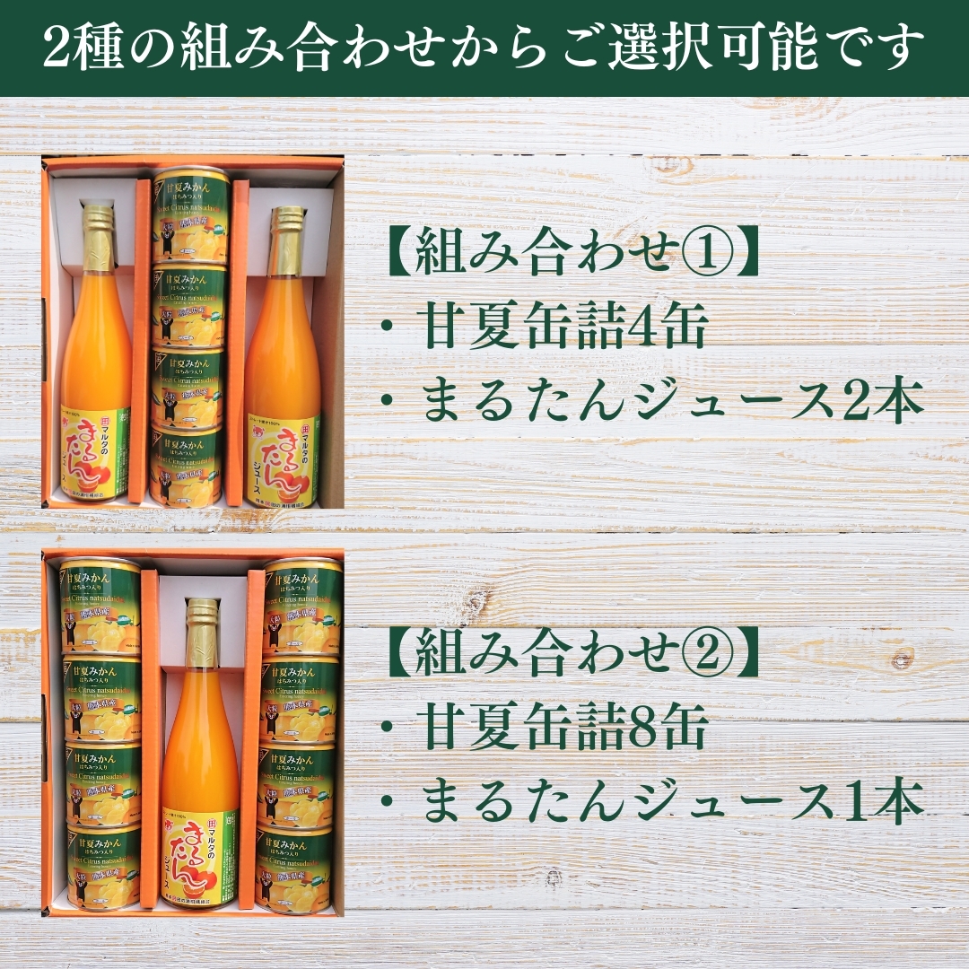 | セット内容を選ぶ | ①甘夏缶詰4缶・まるたんジュース2本 ②甘夏缶詰8缶・まるたんジュース1本 |