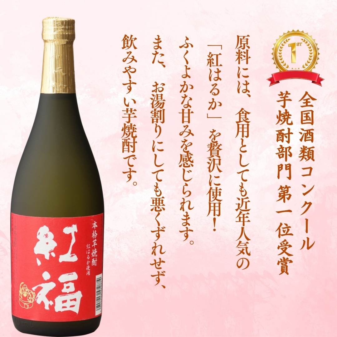 これを贅沢に使用した焼酎「紅福」はふくよかな甘みが特徴の本格芋焼酎です。また、お湯割りにしても悪くずれせず、飲みやすい芋焼酎です。