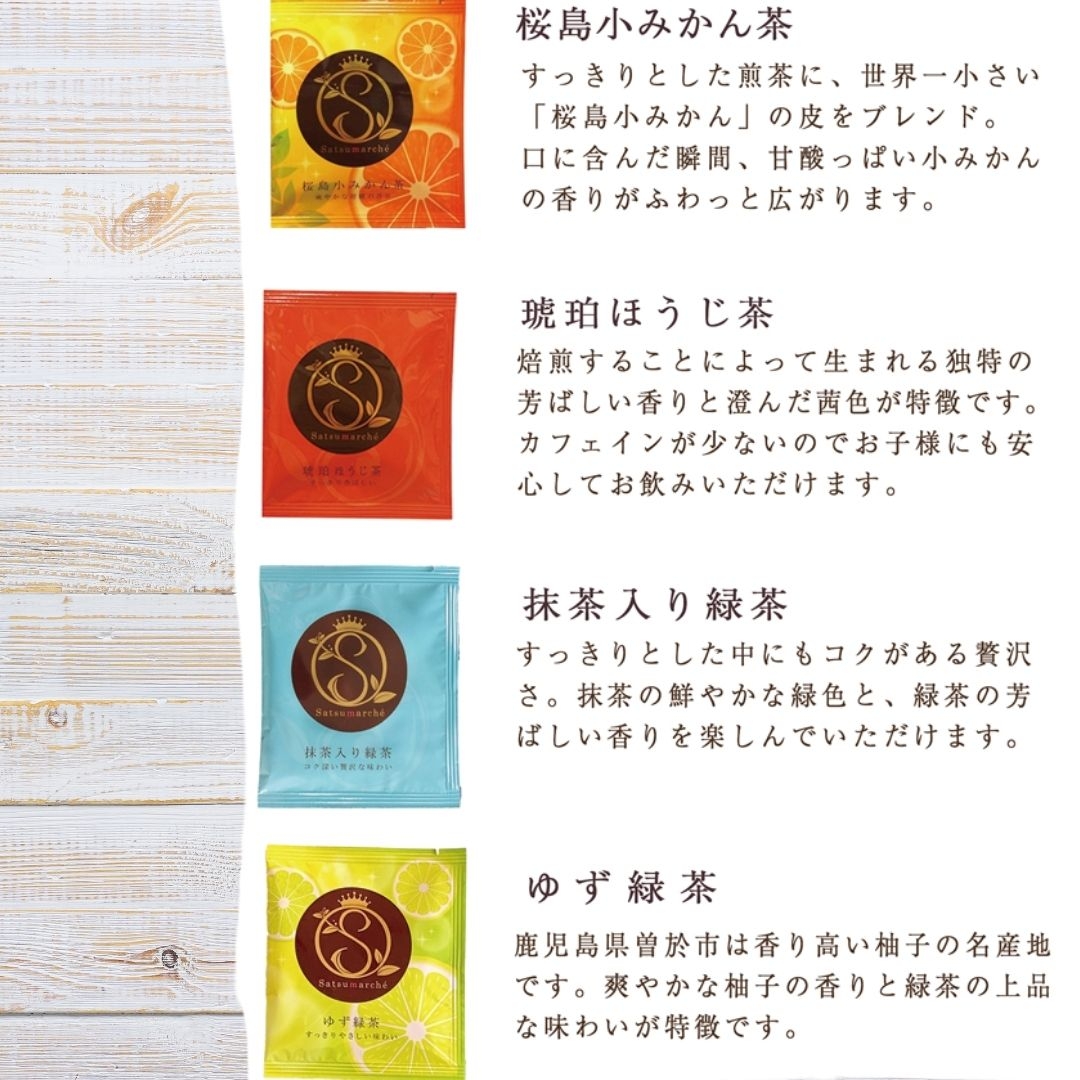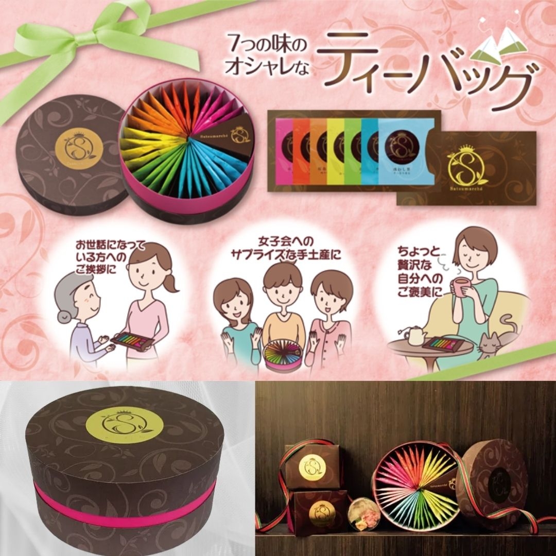 Satsuma-薩摩-の自然で育まれた茶葉と鹿児島名産、桜島小みかん・柚子を使い、風味豊かな7種のティーバッグに仕上げました。虹やマルシェ(市場)をイメージした色とりどりの華やかなパッケージは大切な方への贈り物にもぴったりです。