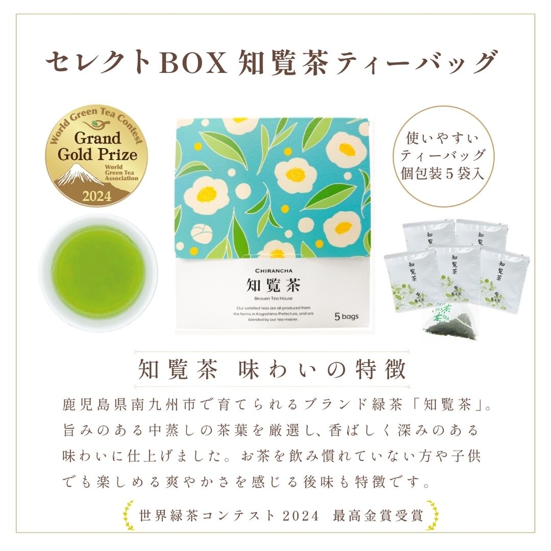 「2024年かごしまの新特産品コンクール」において鹿児島県特産品協会理事長賞を受賞した商品です。また、「世界緑茶コンテスト2024」においても『セレクトBOX 知覧茶ティーバッグ』が最高金賞、『セレクトBOX ほうじ茶ティーバッグ』が金賞を受賞いたしました。