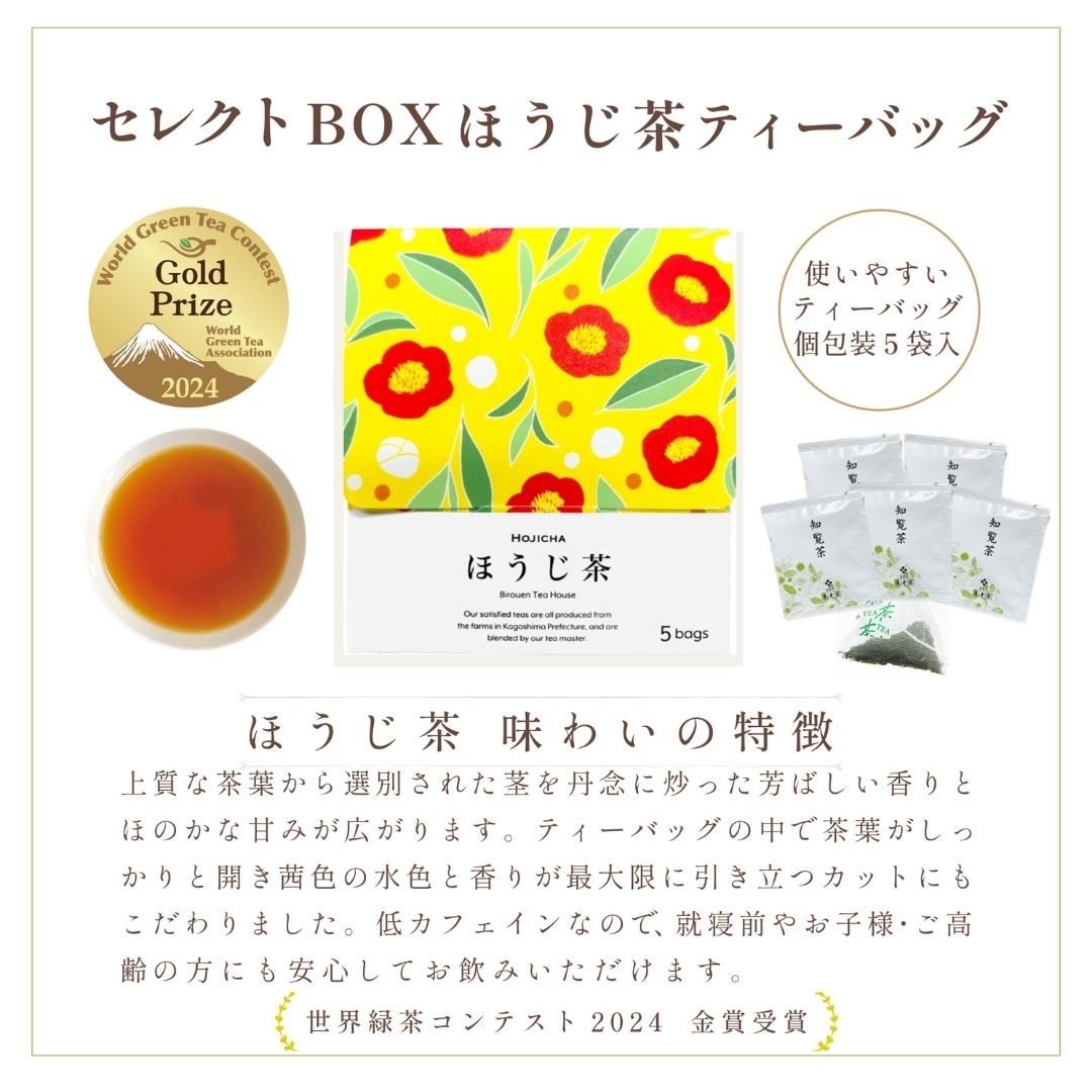 「2024年かごしまの新特産品コンクール」において鹿児島県特産品協会理事長賞を受賞した商品です。また、「世界緑茶コンテスト2024」においても『セレクトBOX 知覧茶ティーバッグ』が最高金賞、『セレクトBOX ほうじ茶ティーバッグ』が金賞を受賞いたしました。