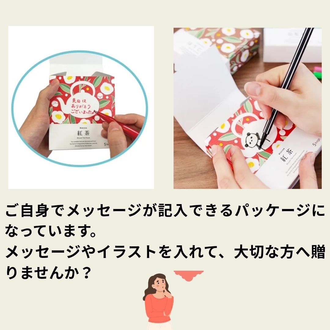 「お茶が持つ、人と人とを繋げる力を大切にしたい」、「お茶を通して、ほっと一息つく文化を若い世代にも伝えたい」そんな思いから生まれました。ちょっとした贈りものに手紙を添えて渡す光景をヒントに、3種類のお茶の箱はそれぞれひとことメッセージを書き込めるパッケージデザインになっています。開けた瞬間のサプライズ感を楽しめる、新しくて楽しい『お茶×コミュニケーション』のプチギフトです。