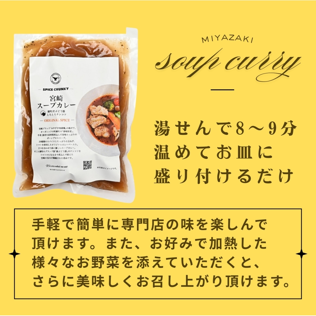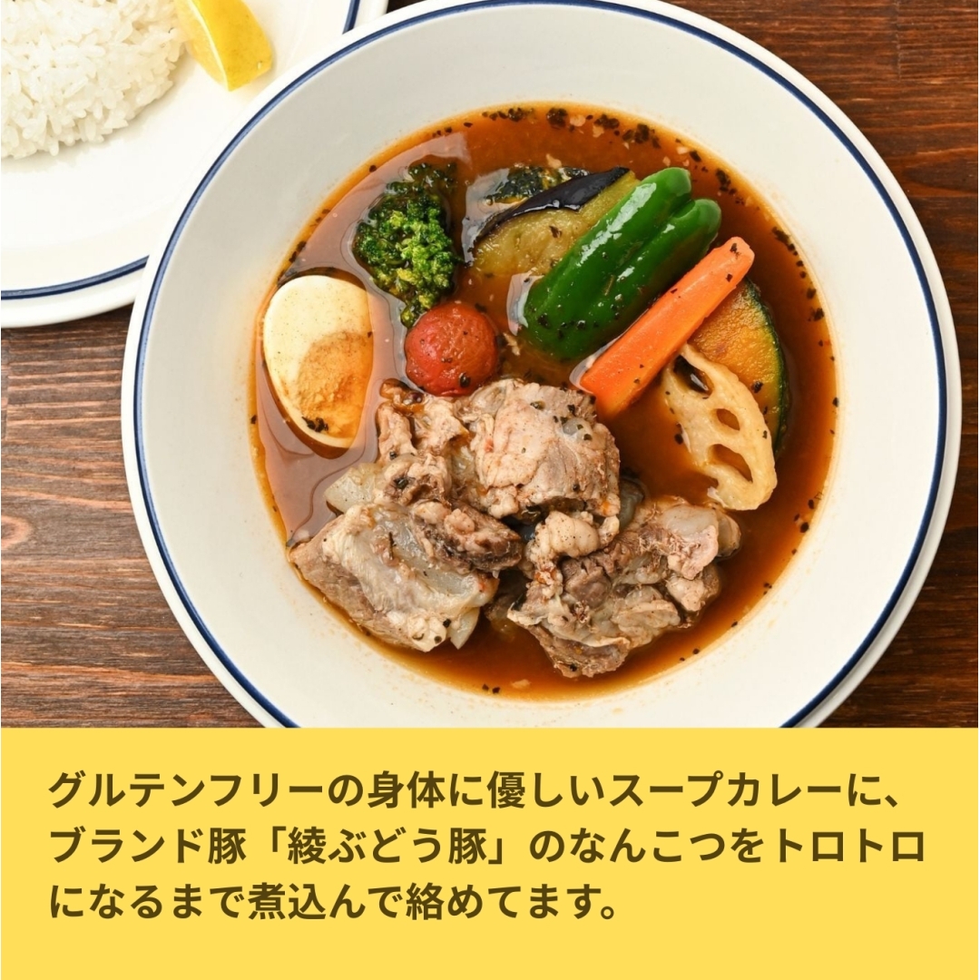 宮崎ブランド「みやざき地頭鶏」の鶏ガラをベースに、オーガニックの町「綾町」の無農薬香味野菜を使った旨味たっぷりのボーンブロススープと20種類のスパイスが融合したグルテンフリーの身体に優しいスープカレーに仕上げました。
