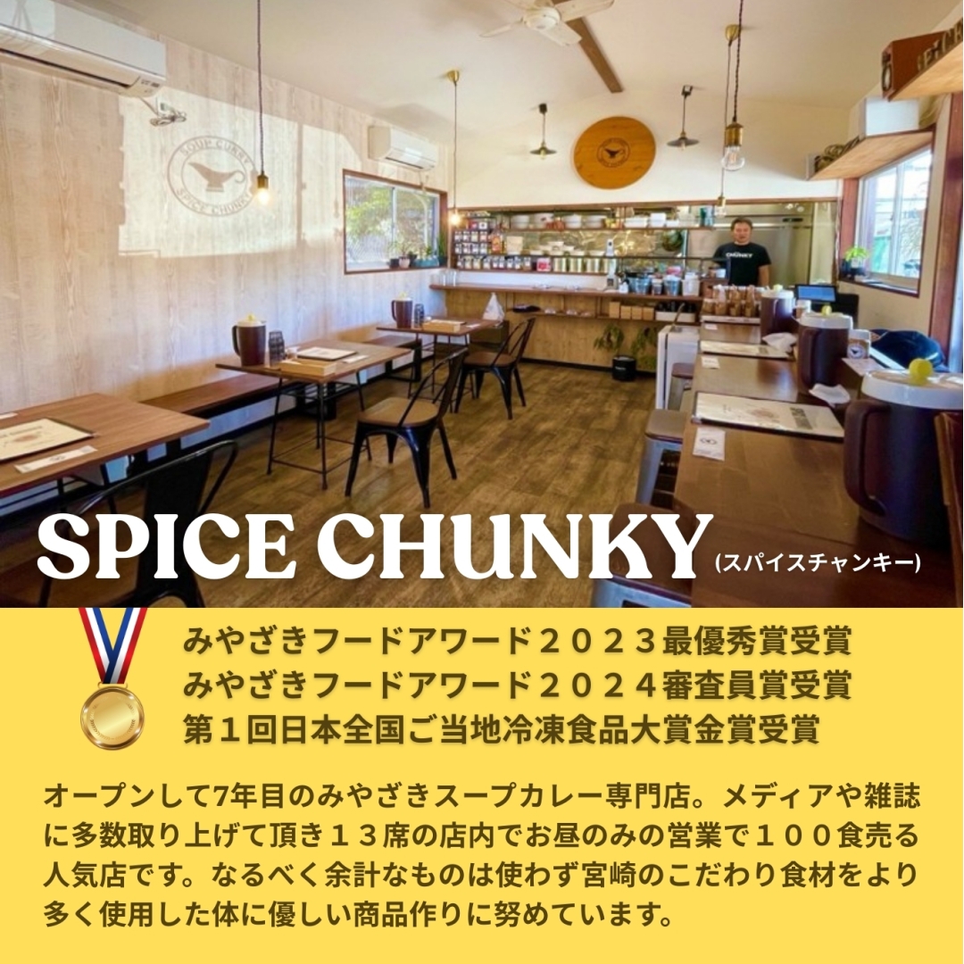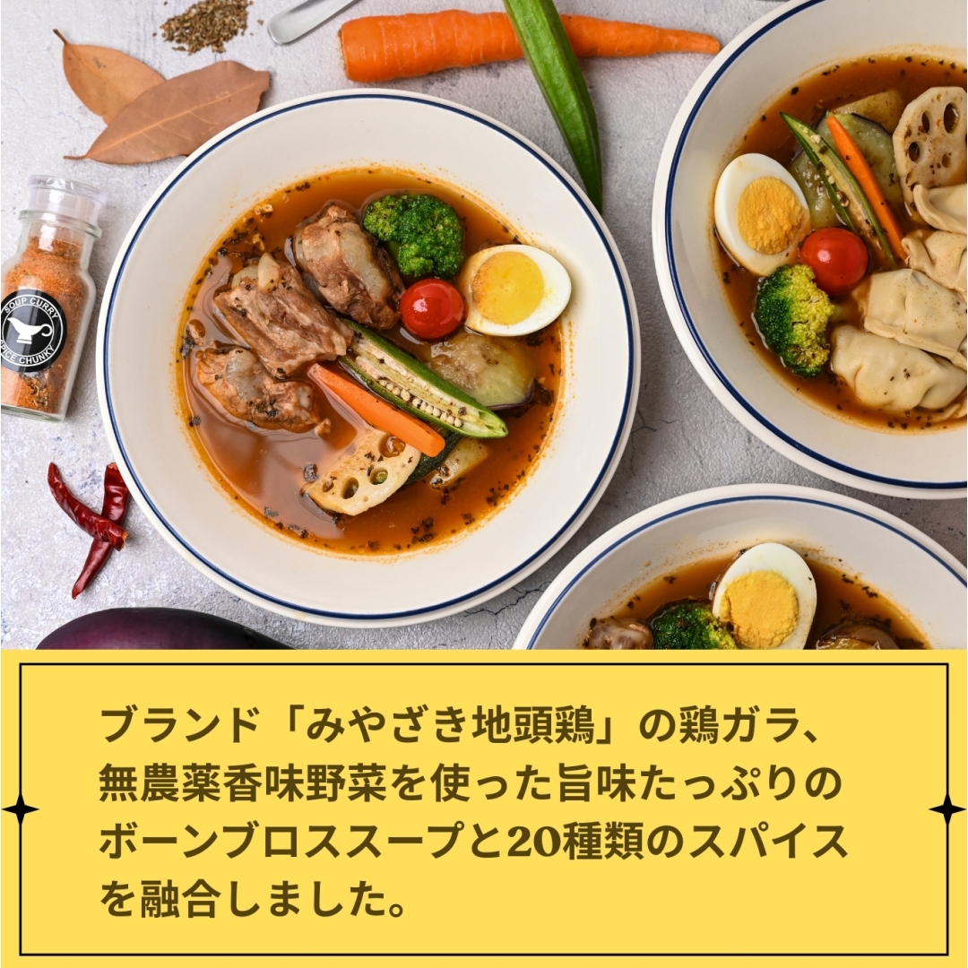 宮崎ブランド「みやざき地頭鶏」の鶏ガラをベースに、オーガニックの町「綾町」の無農薬香味野菜を使った旨味たっぷりのボーンブロススープと20種類のスパイスが融合したグルテンフリーの身体に優しいスープカレーに仕上げました。