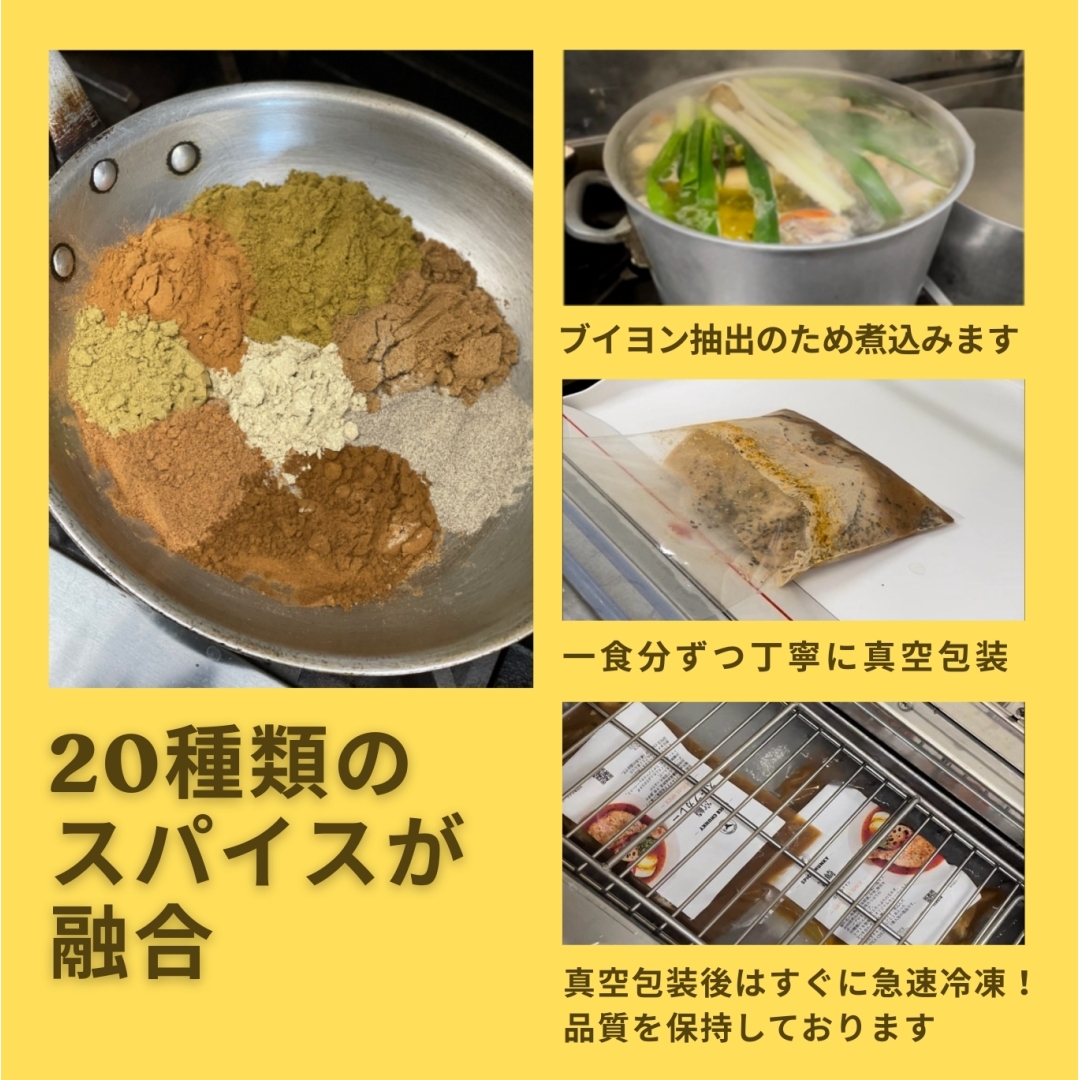豚なんこつ(宮崎県綾町産)、鶏ガラ、豚足骨、牛骨、牛肉、豚肉、玉ねぎ、トマト、長ねぎ、しょうが、にんにく、オリーブオイル、マンゴーチャツネ、クミン、コリアンダー、シナモン、カルダモン、フェンネル、クローブ、ナツメグ、ブラックペッパー、ローリエ、バジル、カイエンペッパー、一味唐辛子、ナンプラー、カキエキス、砂糖、醸造酢