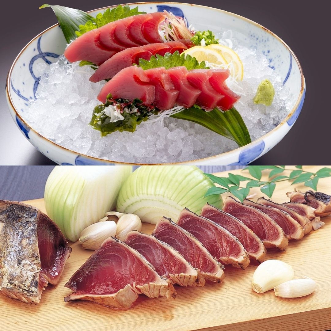 枕崎港水揚げ 一本釣り鰹炭火焼たたき・ぶえん鰹のセットです!!