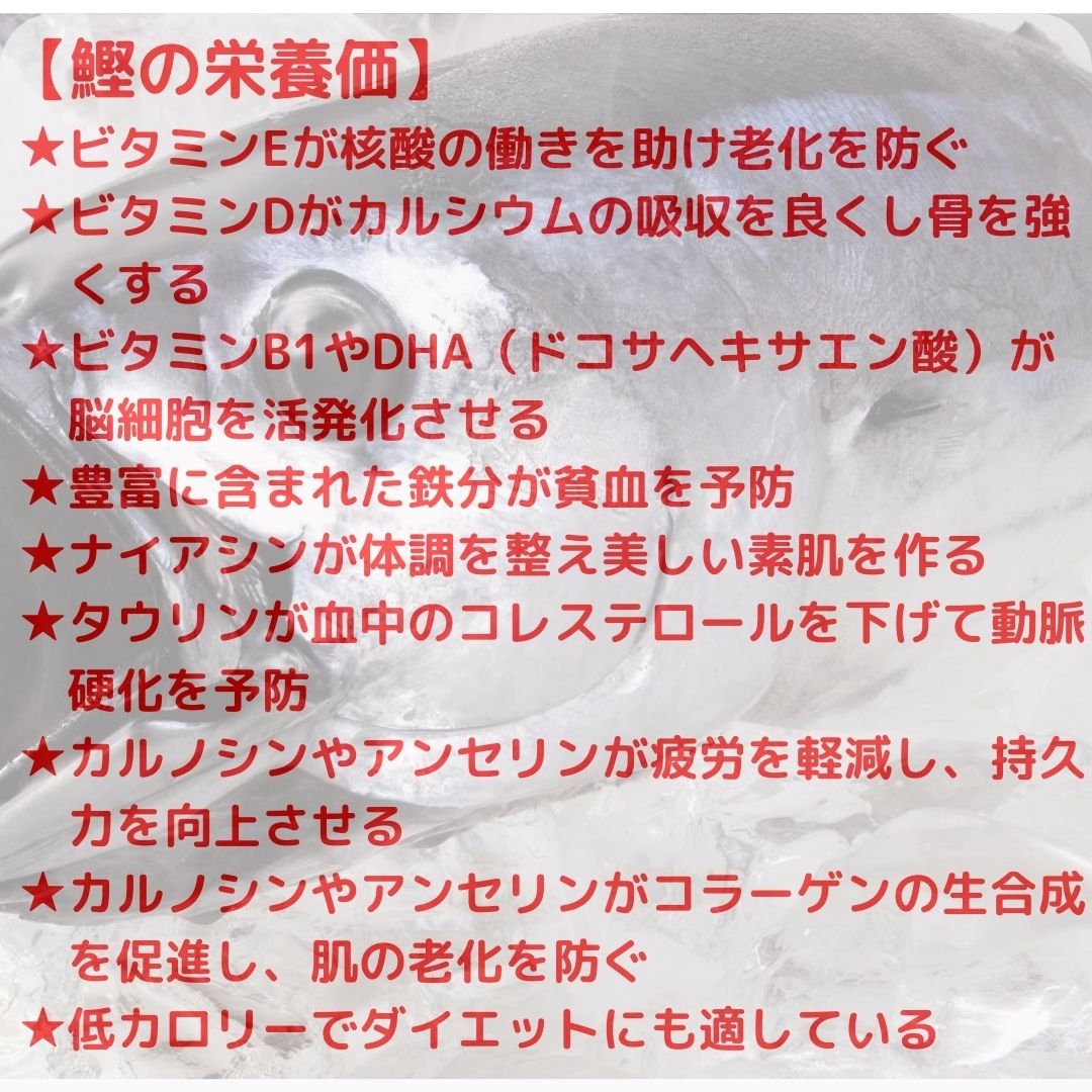 船上で急速凍結された鮮度のよい鰹は、鮮赤色で臭みがなく、モチモチとした食感が特徴です。