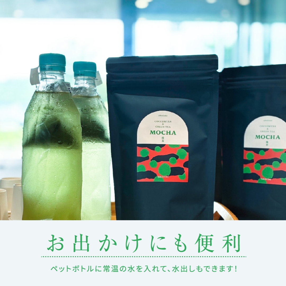 熊本・天草の太陽をたっぷりと浴びた新種の藻“コッコミクサKJ”とやさしい香りの緑茶“さえみどり”をブレンドした、「心と体をととのえるお茶」です。