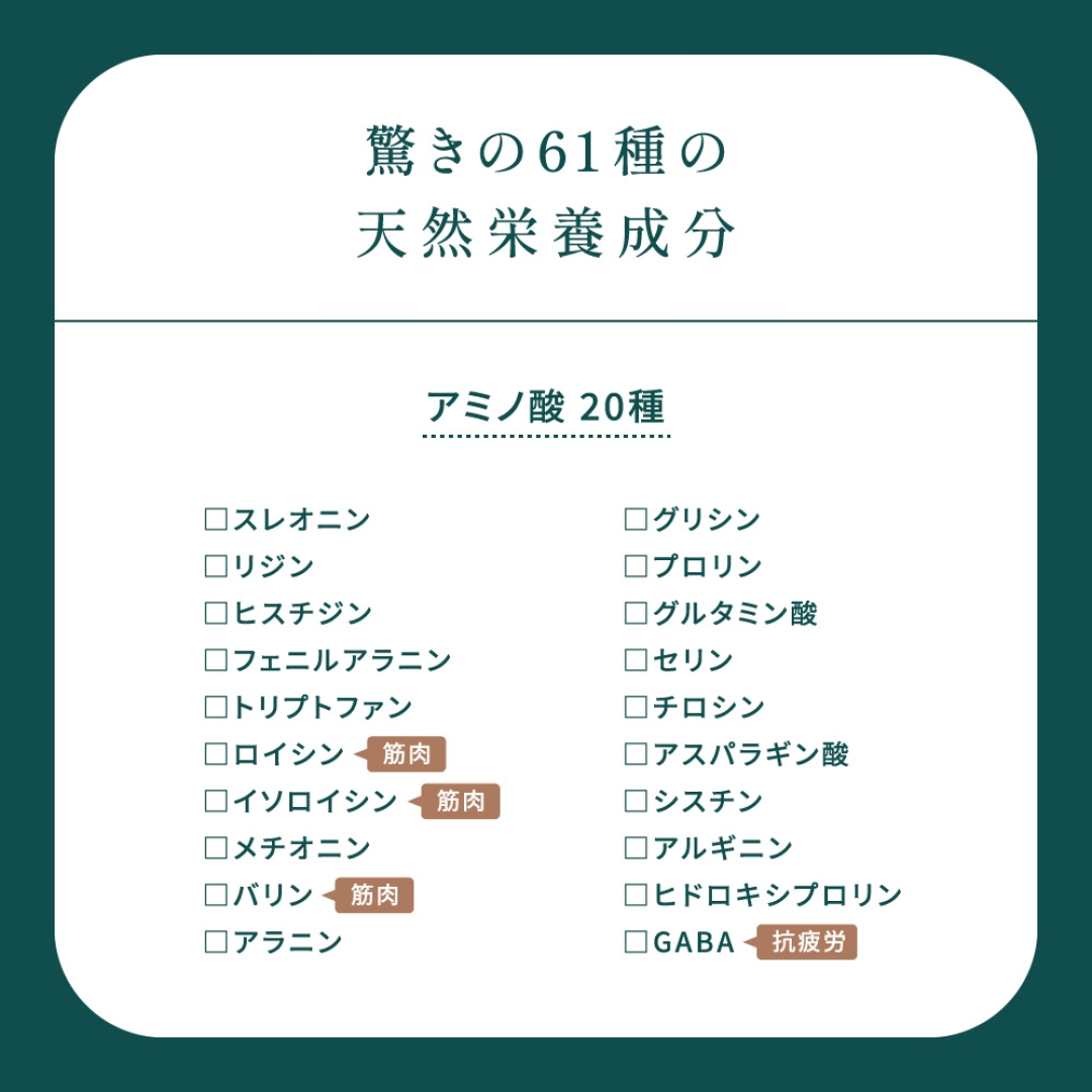 アミノ酸20種、ミネラル9種、不飽和脂肪酸10種、ビタミン13種、その他9種。